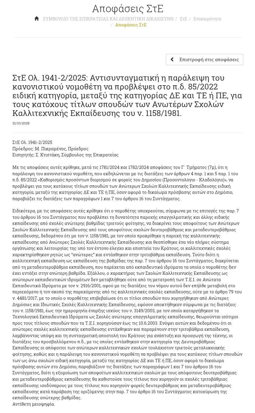 Η Ολομέλεια του ΣτΕ (απόφαση 1941-2/2025), με πρόεδρο τον Μιχάλη Πικραμένο και εισηγήτρια τη Σ. Κιστάκη, διαπίστωσε ότι το ισχύον προεδρικό διάταγμα – που καθορίζει τα επαγγελματικά προσόντα διορισμού στο Δημόσιο – παραβιάζει το Σύνταγμα, καθώς αφήνει εκτός τους αποφοίτους δραματικών σχολών, σχολών χορού και άλλων καλλιτεχνικών ιδρυμάτων, στερώντας τους ίση μεταχείριση με τους πτυχιούχους ΔΕ, ΤΕ και ΠΕ.