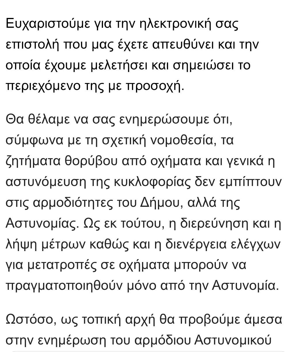 «Επειδή η απάντηση είναι εκτιμητέα μεν, πλην όμως ρίχνει το μπαλάκι στην αστυνομία, την δημοσιοποιώ, εν πρώτοις για να γνωρίζουν οι αρμόδιοι ότι θα αναμένουμε να δούμε αλλαγή», σημειώνει χαρακτηριστικά η κάτοικος.