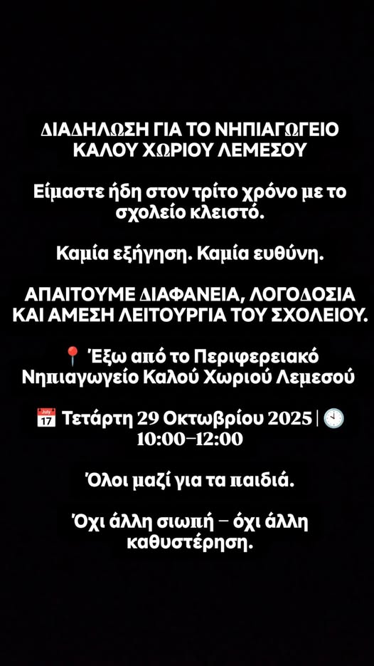 Οι κάτοικοι του χωριού διοργανώνουν διαμαρτυρία την Τετάρτη, 29 Οκτωβρίου 2025, από τις 10:00 έως τις 12:00, έξω από το κτίριο του Περιφερειακού Νηπιαγωγείου Καλού Χωριού, απαιτώντας διαφάνεια, λογοδοσία και την άμεση λειτουργία του σχολείου. Με το σύνθημα «Όλοι μαζί για τα παιδιά – Όχι άλλη σιωπή, όχι άλλη καθυστέρηση», οι γονείς δηλώνουν αποφασισμένοι να συνεχίσουν τον αγώνα τους μέχρι να δοθεί λύση στο πρόβλημα, τονίζοντας ότι η εκπαίδευση των παιδιών τους δεν μπορεί να περιμένει άλλο.