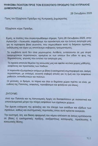 Οι πολίτες που συγκεντρώθηκαν εκφράζουν την αγανάκτησή τους για τη βία και την ανομία, τονίζοντας πως «το σχολείο πρέπει να είναι χώρος ασφάλειας και όχι φόβου». Κατά τη διάρκεια της εκδήλωσης, ετοιμάστηκε ψήφισμα προς Πρόεδρο της Κυπριακής Δημοκρατίας, το οποίο αναμένεται να παραδοθεί επισήμως εντός των επόμενων ημερών. Στο ψήφισμα, οι πολίτες καταδικάζουν τα γεγονότα και ζητούν από την πολιτεία ουσιαστικά και αποτελεσματικά μέτρα για τη διασφάλιση της ασφάλειας των σχολικών χώρων, την αυστηρή εφαρμογή του νόμου, καθώς και την απομάκρυνση εγκληματικών στοιχείων από τις γειτονιές.