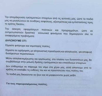 «Είμαστε φιλήσυχοι και νομοταγείς πολίτες. Δεν ζητούμε προνόμια, ζητούμε ασφάλεια. Τα παιδιά μας δικαιούνται να ζουν και να μορφώνονται χωρίς φόβο»
