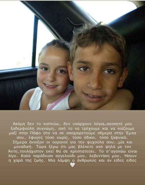 «Ακόμη δεν το πιστεύω, δεν υπάρχουν λόγια… αγαπημένε μου ξαδερφούλη, συγγνώμη. Από το να τρέχουμε και να παίζουμε μαζί στην Πάφο, στο να σε αποχαιρετούμε σήμερα στην Έμπα σου. Έφυγες τόσο νωρίς, τόσο άδικα, τόσο ξαφνικά. Σήμερα άνοιξαν οι ουρανοί για την ψυχούλα σου… μία και μοναδική. Τώρα ξέρω ότι μας βλέπετε από ψηλά με τον Άντη, τουλάχιστον εκεί θα σε προστατεύει. Το “σ’ αγαπώ” είναι λίγο. Καλό παράδεισο, αγγελούδι μου, λεβεντάκι μου. Ήσουν η χαρά της ζωής. Μια λάμψη ο άνθρωπος και αν είδες, είδες».