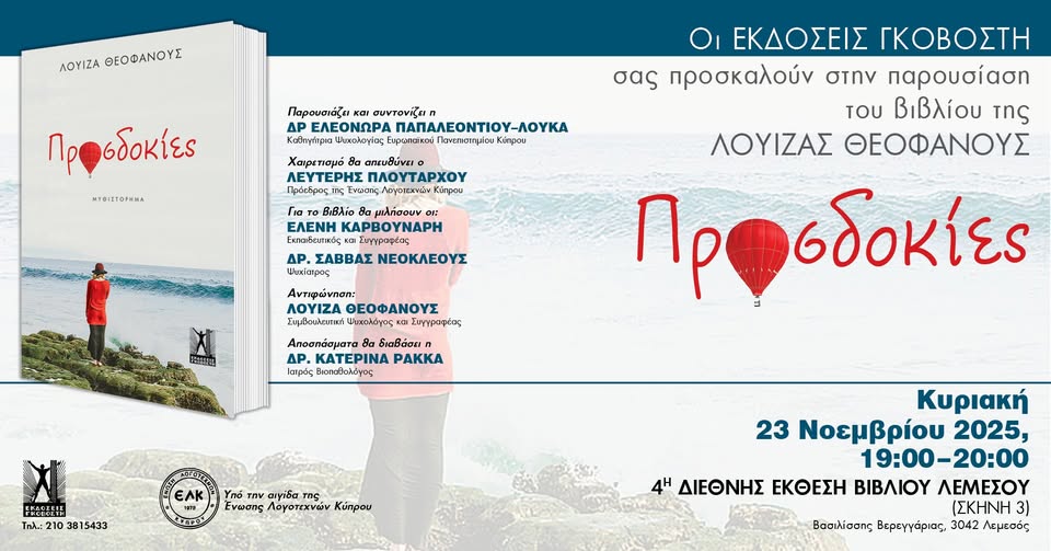 Η Συμβουλευτική Ψυχολόγος και Ψυχοθεραπεύτρια Λουίζα Θεοφάνους θα παρουσιάσει το νέο της βιβλίο «ΠΡΟΣΔΟΚΙΕΣ» την Κυριακή, 23 Νοεμβρίου, στις 19:00, στη Διεθνή Έκθεση Βιβλίου Λεμεσού. Το βιβλίο πραγματεύεται κεντρικά θέματα της σύγχρονης κοινωνίας, όπως οι ανθρώπινες σχέσεις, η αυτοεκτίμηση, τα διαζύγια, οι αναπηρίες, η βία στην οικογένεια και η μοναξιά, προσφέροντας αφορμή για συζήτηση και ανάλυση με την ίδια τη συγγραφέα.
