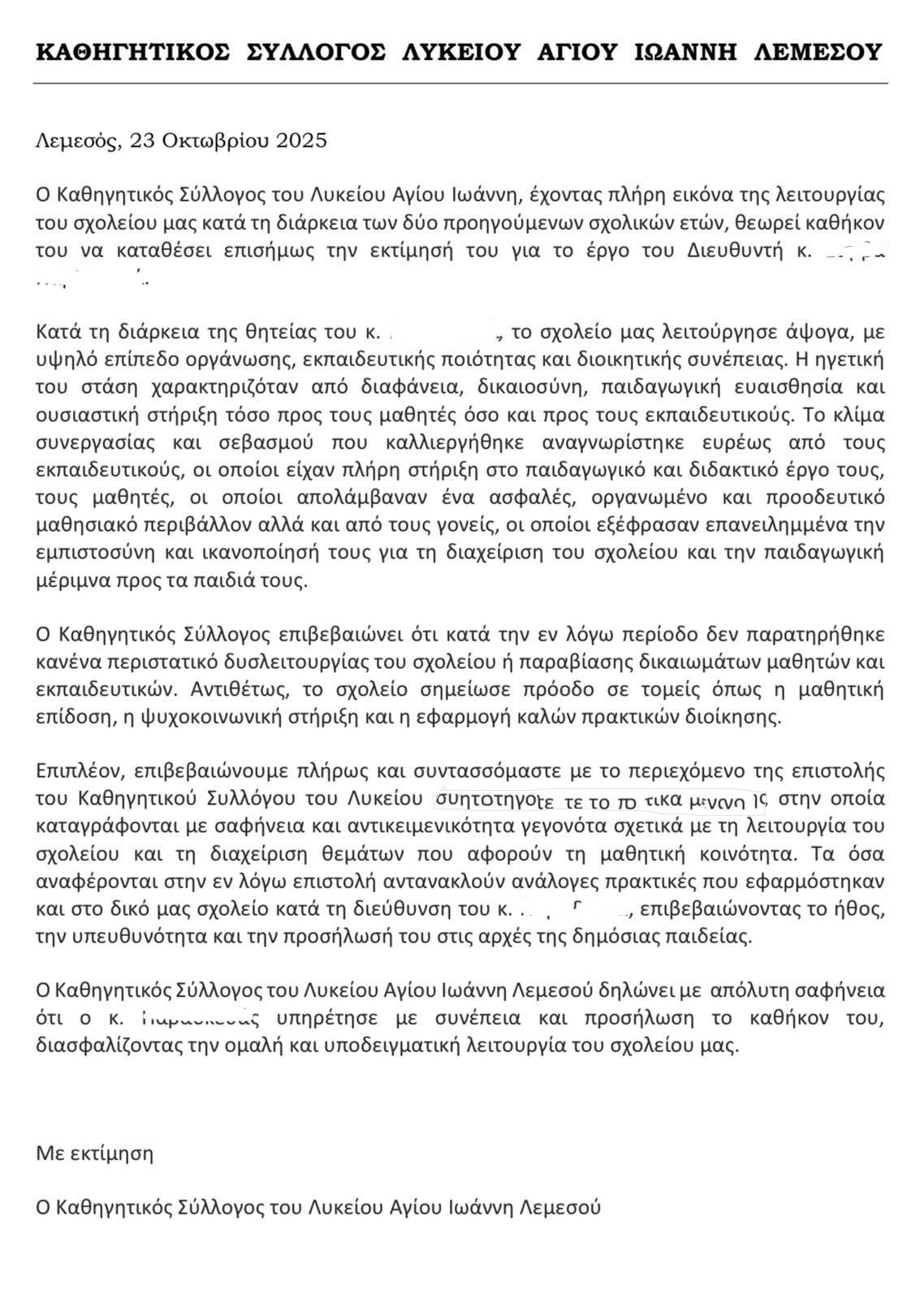 Συγκεκριμένα, ο Καθηγητικός Σύλλογος του Λυκείου Αγίου Ιωάννη, μέσα από την τοποθέτησή του, αναγνωρίζει δημόσια το έργο, το ήθος και την παιδαγωγική ευαισθησία του διευθυντή, ο οποίος υπηρέτησε με συνέπεια και αφοσίωση στο σχολείο της Λεμεσού. «Η παιδεία δεν χτίζεται με εντυπώσεις, αλλά με έργο, συνέπεια και σεβασμό προς τους ανθρώπους της. Ο Καθηγητικός Σύλλογος του Λυκείου Αγίου Ιωάννη Λεμεσού εξέδωσε επίσημη επιστολή εκτίμησης για το έργο του ΧΧΧ, επιβεβαιώνοντας την υπευθυνότητα, τη δικαιοσύνη και την παιδαγωγική ευαισθησία που χαρακτήριζαν τη θητεία του στο σχολείο τους. Η δημόσια αυτή τοποθέτηση αποτελεί έμπρακτη αναγνώριση του ήθους, της συνέπειας και της αφοσίωσής του στην εκπαιδευτική αποστολή. Η στήριξη αυτή μάς τιμά και μας υπενθυμίζει πως, όταν υπάρχει ήθος, ενότητα και αλήθεια, κανένα ψευδές αφήγημα δεν μπορεί να αλλοιώσει το πραγματικό έργο ενός εκπαιδευτικού. Το σχολείο μας συνεχίζει να πορεύεται με διαφάνεια, ενότητα και σεβασμό, υπηρετώντας με συνέπεια τις αξίες της δημόσιας παιδείας.