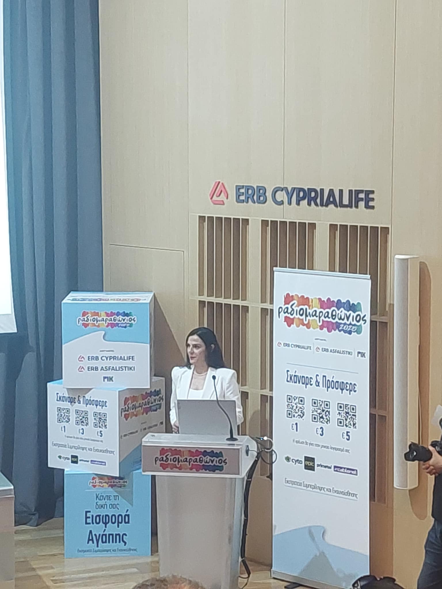Η επίσημη έναρξη των δράσεων του φετινού Ραδιομαραθώνιου πραγματοποιήθηκε την Τρίτη 21 Οκτωβρίου, στο αμφιθέατρο των κεντρικών γραφείων του Ομίλου ERB Cyprus Insurance Holdings στη Λευκωσία. Η κύρια εκστρατεία οικονομικής ενίσχυσης του Ραδιομαραθώνιου θα πραγματοποιηθεί στις 3 και 4 Νοεμβρίου, καλώντας όλους να συμμετάσχουν με το σύνθημα: «Μαζί μπορούμε, για όλα τα παιδιά. Η δράση αναδεικνύει την προσπάθεια του Ομίλου ERB CYPRUS και των εταιρειών του, ERB CYPRIALIFE και ERB ASFALISTIKI, να συμβάλλουν σε μια βιώσιμη κοινωνία που ενσωματώνει όλα τα μέλη της, δίνοντας έμφαση ειδικά στα παιδιά, σε συνεργασία με το ΡΙΚ.