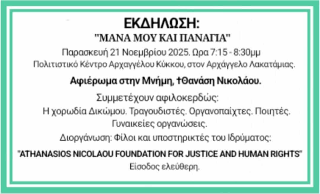 Η ξεχωριστή εκδήλωση τιμής και μνήμης θα πραγματοποιηθεί την Παρασκευή 21 Νοεμβρίου 2025, στο Πολιτιστικό Κέντρο Αρχαγγέλου Κύκκου στη Λακατάμια, με τίτλο «Μάνα μου και Παναγία». Η βραδιά είναι αφιερωμένη στον αδικοχαμένο Θανάση Νικολάου, του οποίου η ιστορία συγκλόνισε το Παγκύπριο και αφύπνισε τη συλλογική συνείδηση γύρω από την αλήθεια, τη δικαιοσύνη και τα ανθρώπινα δικαιώματα. Η εκδήλωση θα ξεκινήσει στις 7:15 και θα διαρκέσει μέχρι τις 8:30 το βράδυ, διοργανώνεται από φίλους και υποστηρικτές του , με στόχο να κρατήσει ζωντανή τη μνήμη και το όραμα του Θανάση για μια κοινωνία πιο δίκαιη και ανθρώπινη.