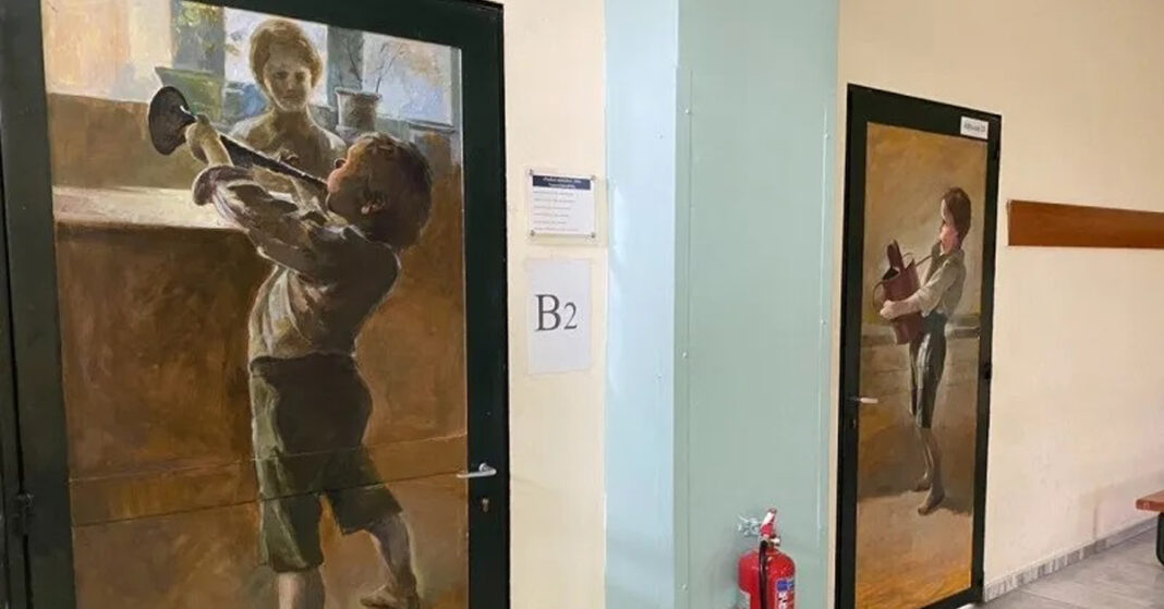 Τα «Μπλε Πουλιά» του Αλέκου Φασιανού, «Το παιδί με το περιστέρι» του Πάμπλο Πικάσο και ακόμα 18 γνωστά έργα τέχνης Ελλήνων και ξένων καλλιτεχνών, που φιλοτέχνησαν έξι μαθητές στις πόρτες των αιθουσών διδασκαλίας