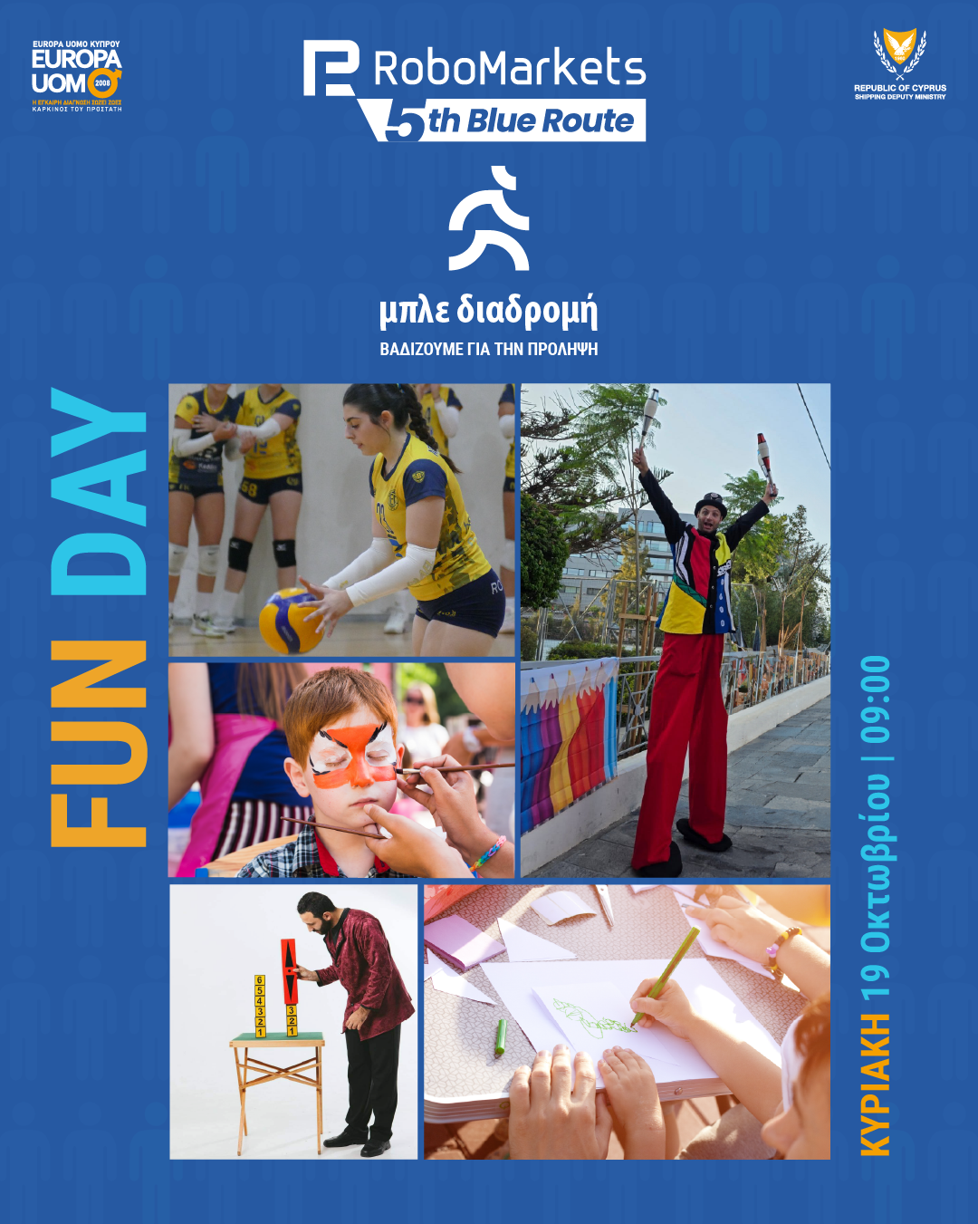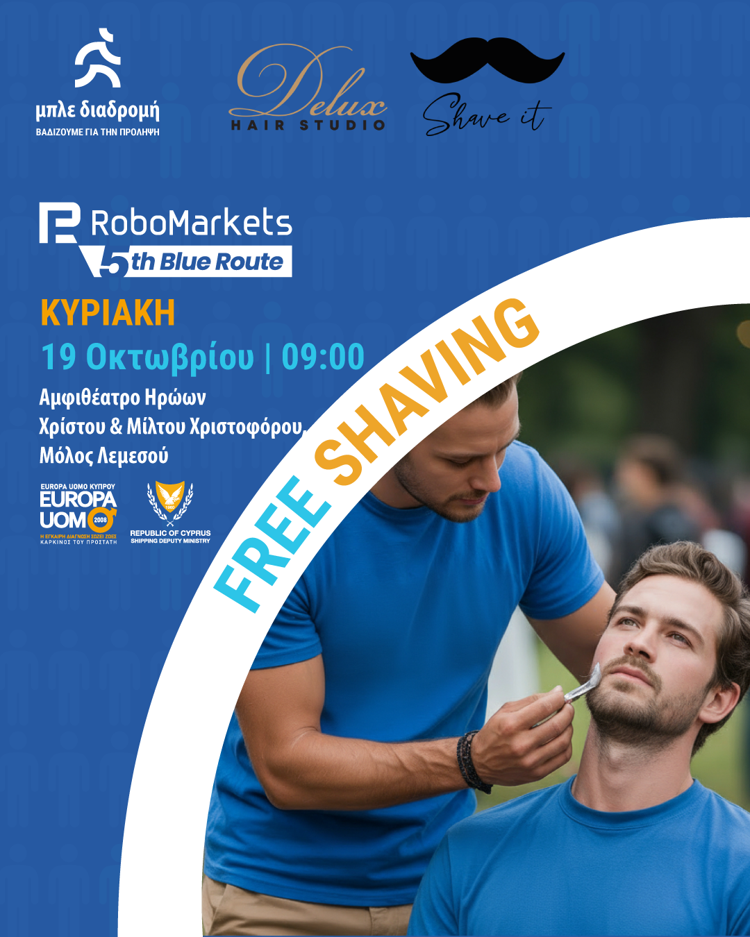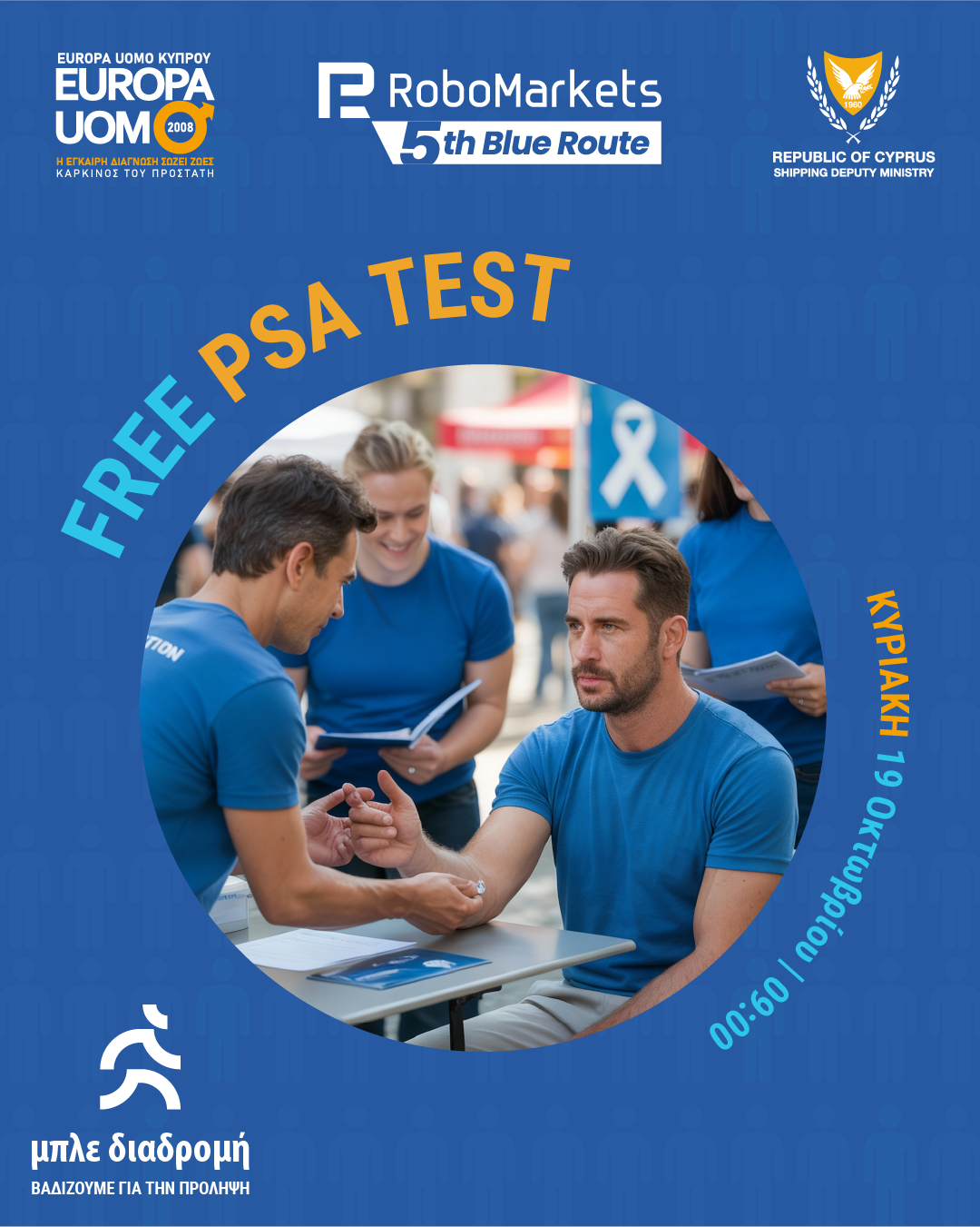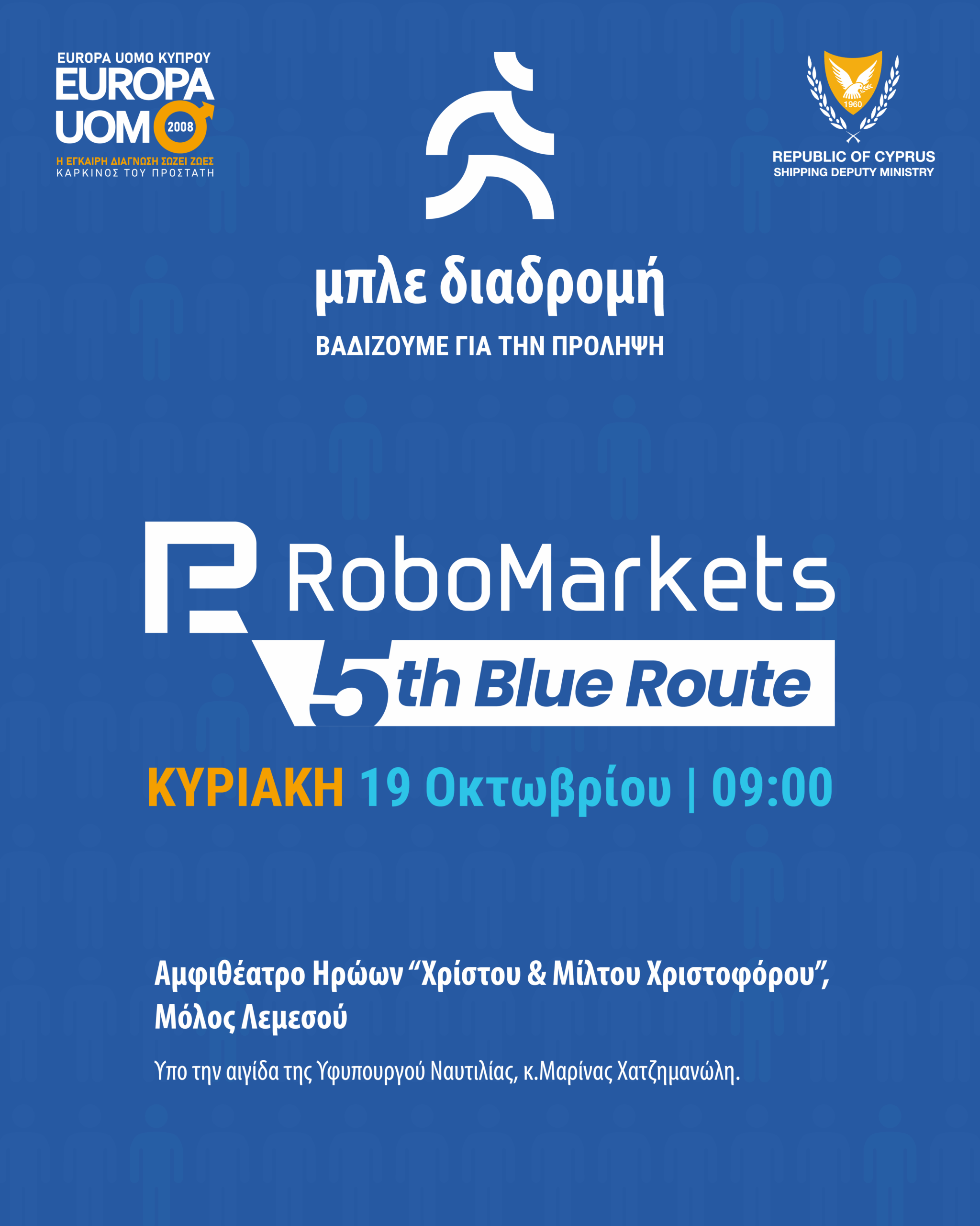 Αυτή την Κυριακή, 19 Οκτωβρίου 2025, η Λεμεσός «ντύνεται» μπλε για να στηρίξει τη μάχη κατά του καρκίνου του προστάτη, στο πλαίσιο της «RoboMarkets 5ης Μπλε Διαδρομής για τη Ζωή». Η δράση, που πραγματοποιείται για πέμπτη συνεχή χρονιά αποτελεί πλέον θεσμό στο πλαίσιο του φεστιβάλ ΛΕΜΕΣΙΑ, τελεί υπό την αιγίδα της Υφυπουργού Ναυτιλίας κ. Μαρίνας Χατζημανώλη και του Δημάρχου Λεμεσού κ. Γιάννη Αρμεύτη. Η εκκίνηση θα δοθεί στις 09:00πμ, από το Αμφιθέατρο Ηρώων Χρίστου & Μίλτου Χριστοφόρου στον Μόλο Λεμεσού, με διαδρομή 2 χλμ., προσβάσιμη σε όλες τις ηλικίες.