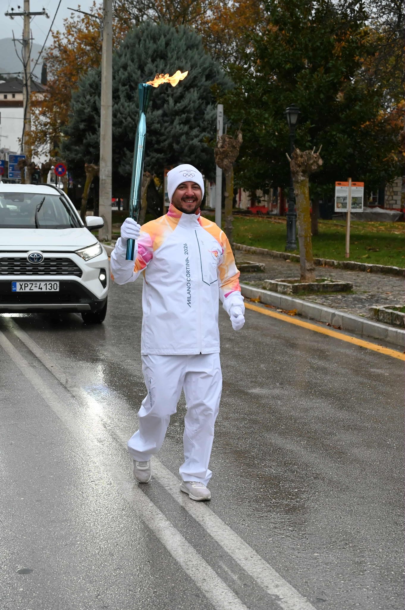 Ο Ολυμπιονίκης Πέτρος Γκαϊδατζής κρατά την Ολυμπιακή Φλόγα στα Καλάβρυτα, έναν τόπο με βαθιά ιστορία και έντονο συμβολισμό.