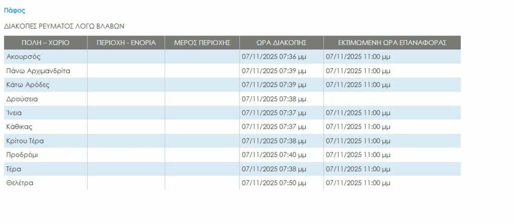 Ωστόσο, τα καταρρακτώδη νερά προκάλεσαν διακοπές ρεύματος σε αρκετές κοινότητες, μεταξύ των οποίων: Κάτω Αρόδες, Κάθικα, Πάνω Αρχιμανδρίτα, Ακουρσός, Δρούσεια, Ίνεια, Κρίτου Τέρα, Προδρόμι, Τέρα και Θελέτρα.