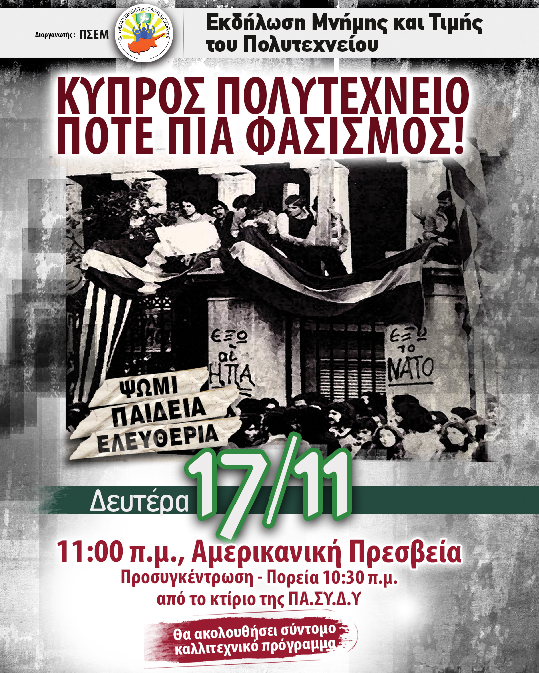Στους δρόμους της Λευκωσίας βρίσκονται σήμερα οι μαθητές, συμμετέχοντας στις εκδηλώσεις για την 17η Νοεμβρίου, επέτειο της εξέγερσης του Πολυτεχνείου του 1973.