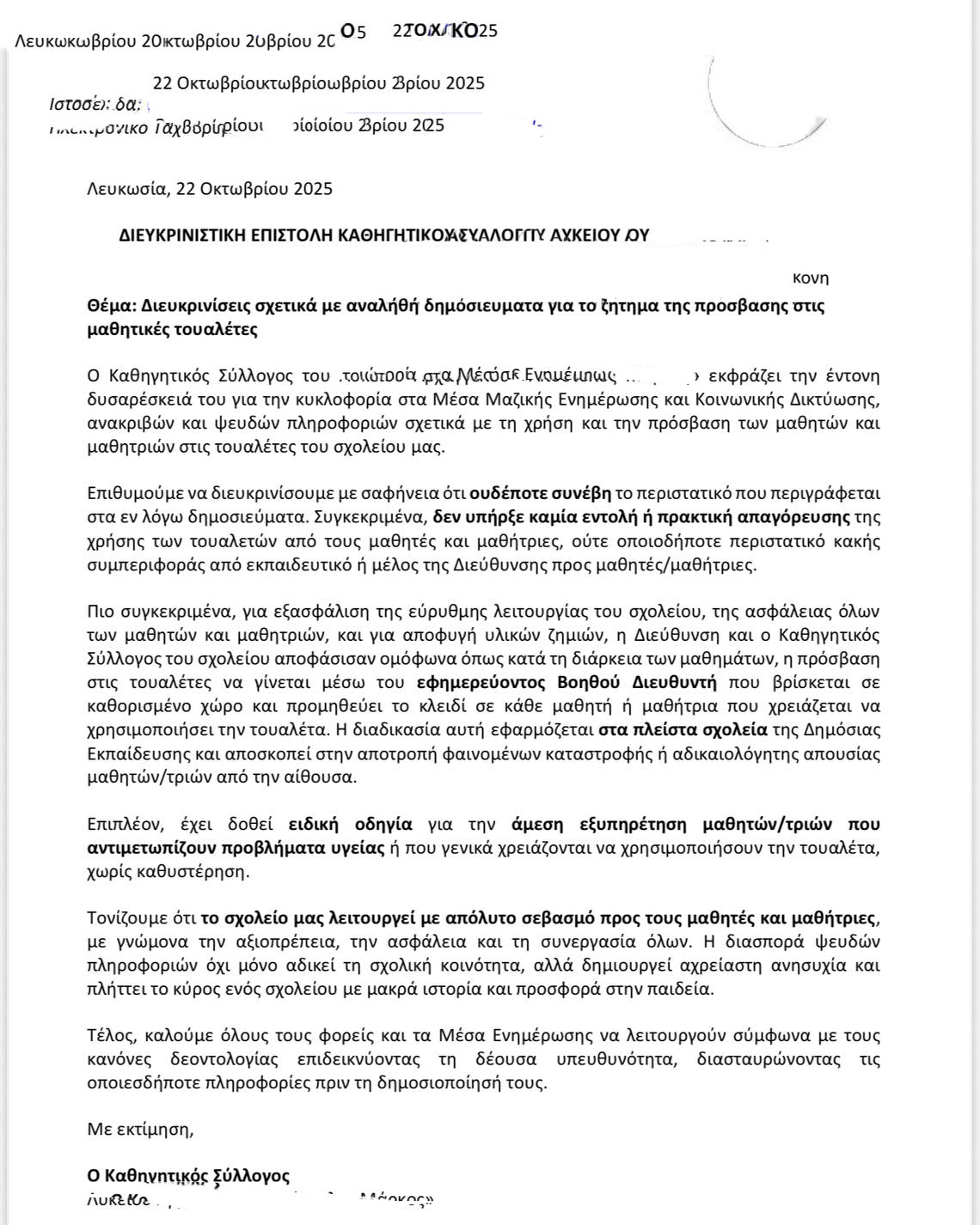 Ο Καθηγητικός Σύλλογος του Λυκείου Λευκωσίας εξέδωσε διευκρινιστική επιστολή, με αφορμή τα αναληθή δημοσιεύματα-όπως ισχυρίζεται- που κυκλοφόρησαν στα Μέσα Μαζικής Ενημέρωσης και στα κοινωνικά δίκτυα, αναφορικά με την πρόσβαση των μαθητών και μαθητριών στις τουαλέτες του σχολείου.