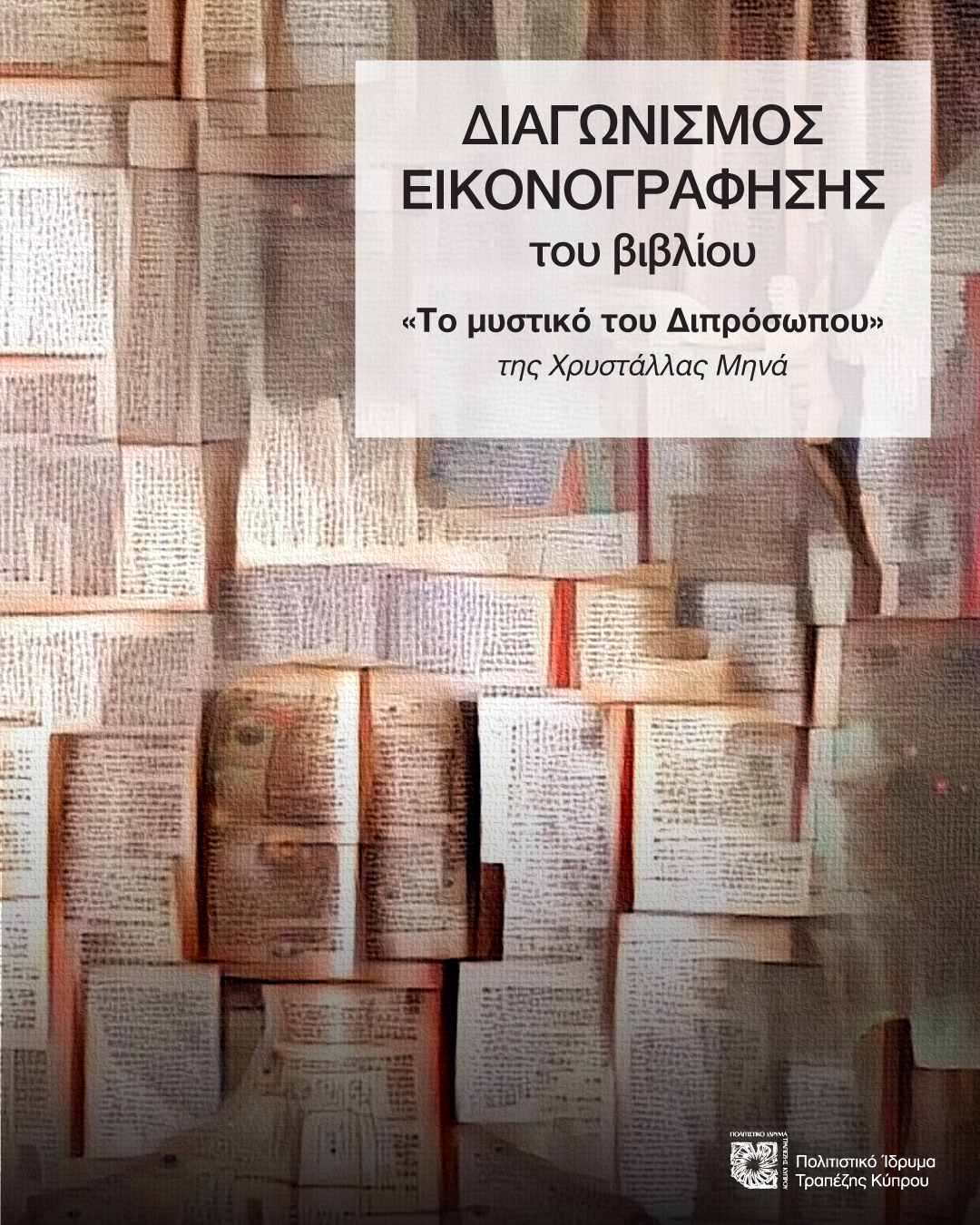 Το Πολιτιστικό Ίδρυμα Τραπέζης Κύπρου προκηρύσσει διαγωνισμό εικονογράφησης του βιβλίου «Το μυστικό του διπρόσωπου» της Χρυστάλλας Μηνά, δίνοντας την ευκαιρία σε καλλιτέχνες να δώσουν ζωή στις σελίδες του μέσα από το δικό τους ταλέντο.