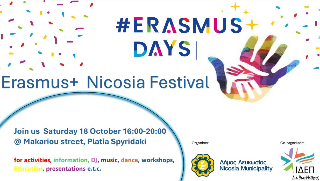 Ένα μοναδικό φεστιβάλ αφιερωμένο στο πρόγραμμα Erasmus+, στο πλαίσιο των #ErasmusDays 2025, διοργανώνουν ο Δήμος Λευκωσίας και το Ίδρυμα Διαχείρισης Ευρωπαϊκών Προγραμμάτων Διά Βίου Μάθησης (ΙΔΕΠ).