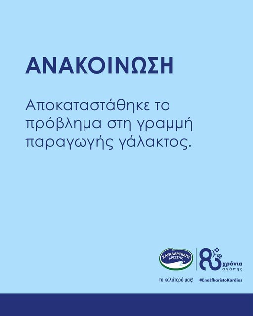Η εταιρεία Χαραλαμπίδης Κρίστης ενημερώνει υπεύθυνα το κοινό ότι, μετά από ενδελεχείς ελέγχους σε όλα τα στάδια της παραγωγής και διανομής γάλακτος, εντοπίστηκε η αιτία του προβλήματος που οδήγησε σε διαφοροποίηση στη διάρκεια ζωής περιορισμένου αριθμού συσκευασιών φρέσκου γάλακτος, το οποίο έχει πλέον αποκατασταθεί.