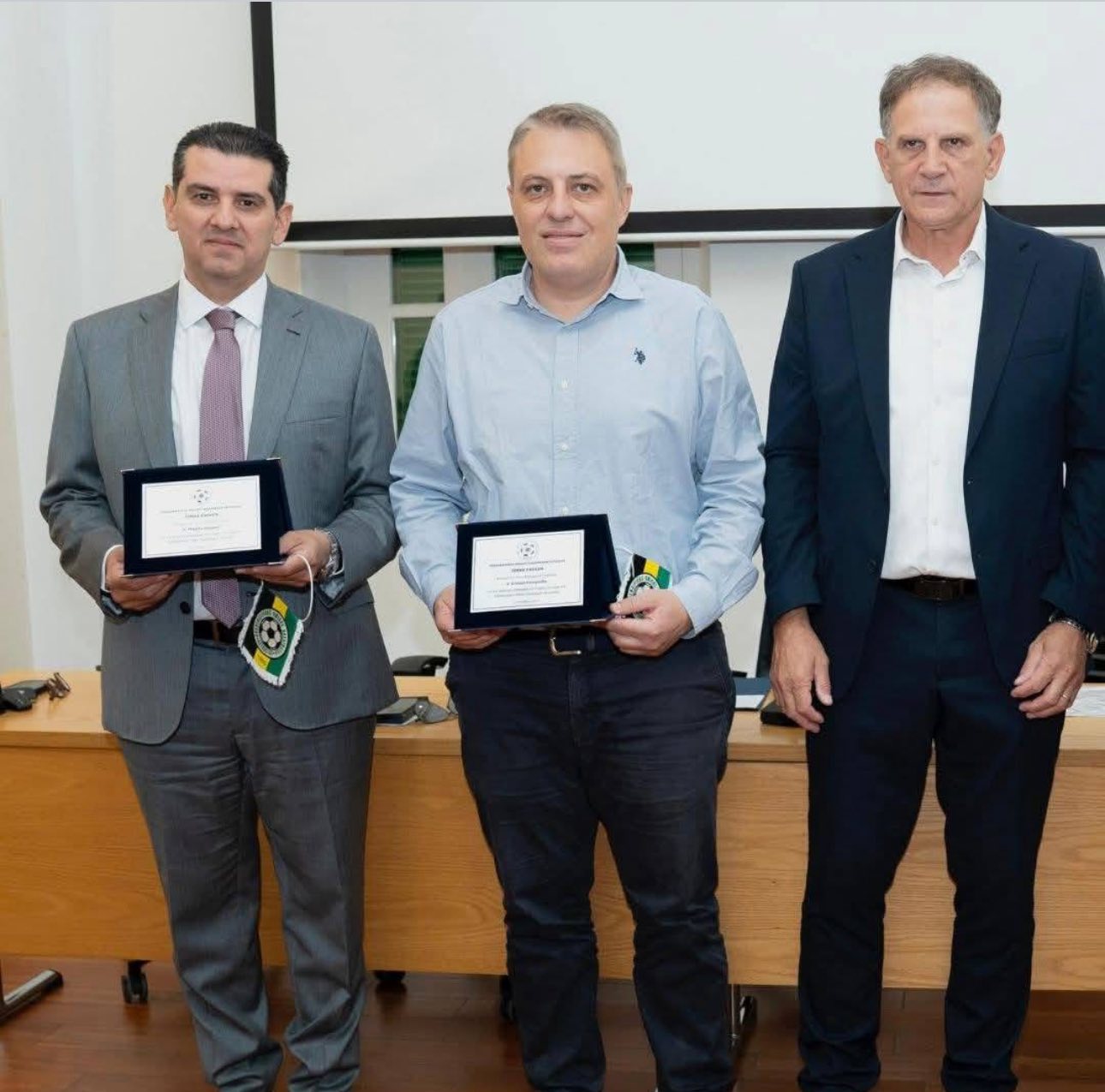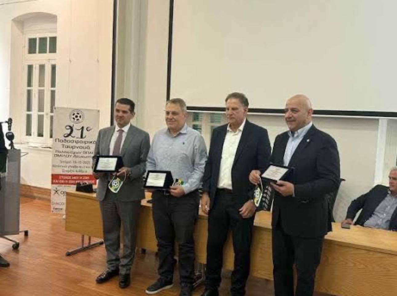 Ο Πρόεδρος του Ποδοσφαιρικού Ομίλου Παλαιμάχων Λευκωσίας, Κώστας Σιαξιατές, κατά τη διάρκεια της δημοσιογραφικής διάσκεψης για το 21ο Ποδοσφαιρικό Τουρνουά Παλαιμάχων Λευκωσίας – ΟΠΑΠ, τίμησε τον Υπουργό Υγείας κ. Μιχάλη Δαμιανού, τον Δήμαρχο Στροβόλου κ. Σταύρο Σταυρινίδη και τον Πρόεδρο της Κυπριακής Ομοσπονδίας Ποδοσφαίρου κ. Χάρη Λοϊζίδη για την πολύτιμη προσφορά τους στον Αθλητισμό και τον Πολιτισμό.