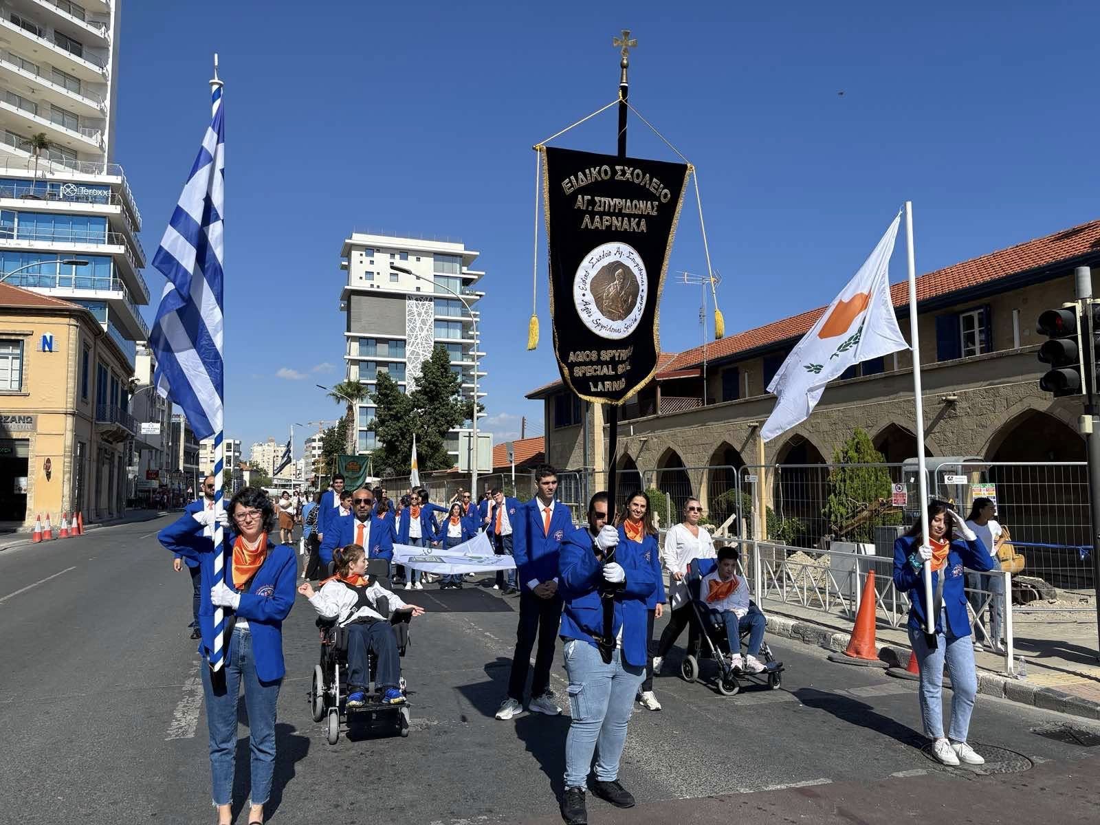 Με συγκίνηση και περηφάνια γιόρτασαν την επέτειο του «ΟΧΙ» οι μαθητές και οι δάσκαλοι του Ειδικού Σχολείου «Άγιος Σπυρίδωνας», στην Λάρνακα. Παιδιά και δάσκαλοι έστειλαν το δικό τους μήνυμα ελευθερίας και ελπίδας