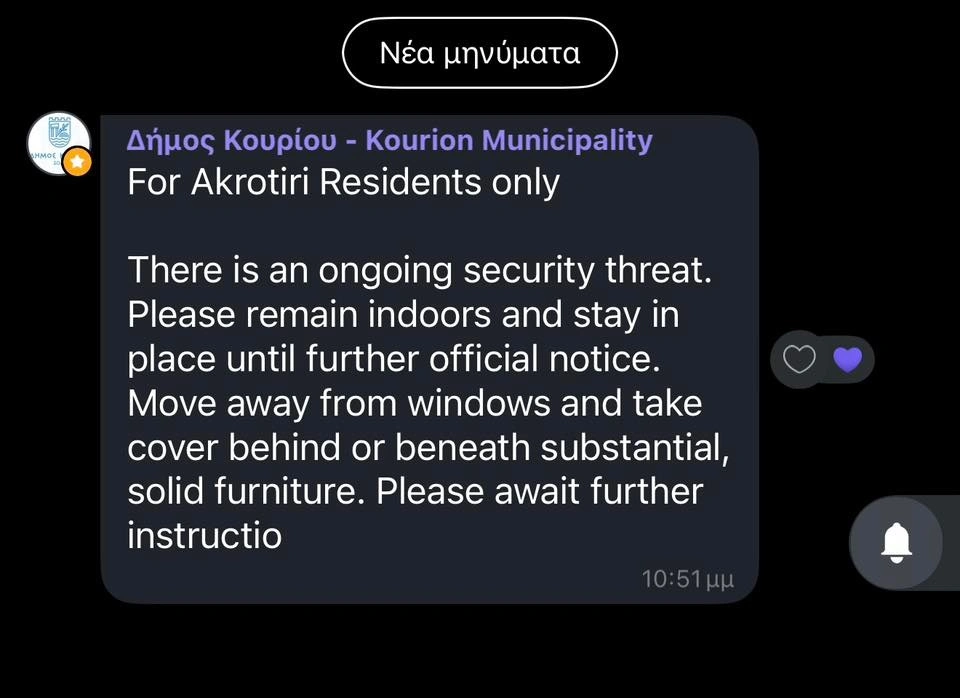 Συναγερμός έχει σημάνει πριν λίγη ώρα στο Ακρωτήρι, με τον Δήμο Κουρίου να εκδίδει μήνυμα προς τους κατοίκους. Η ενεργοποίηση των μέτρων έχει πλέον λήξει, ενώ οι αρμόδιες αρχές συνεχίζουν να παρακολουθούν στενά την κατάσταση στο πλαίσιο των καθιερωμένων διαδικασιών.