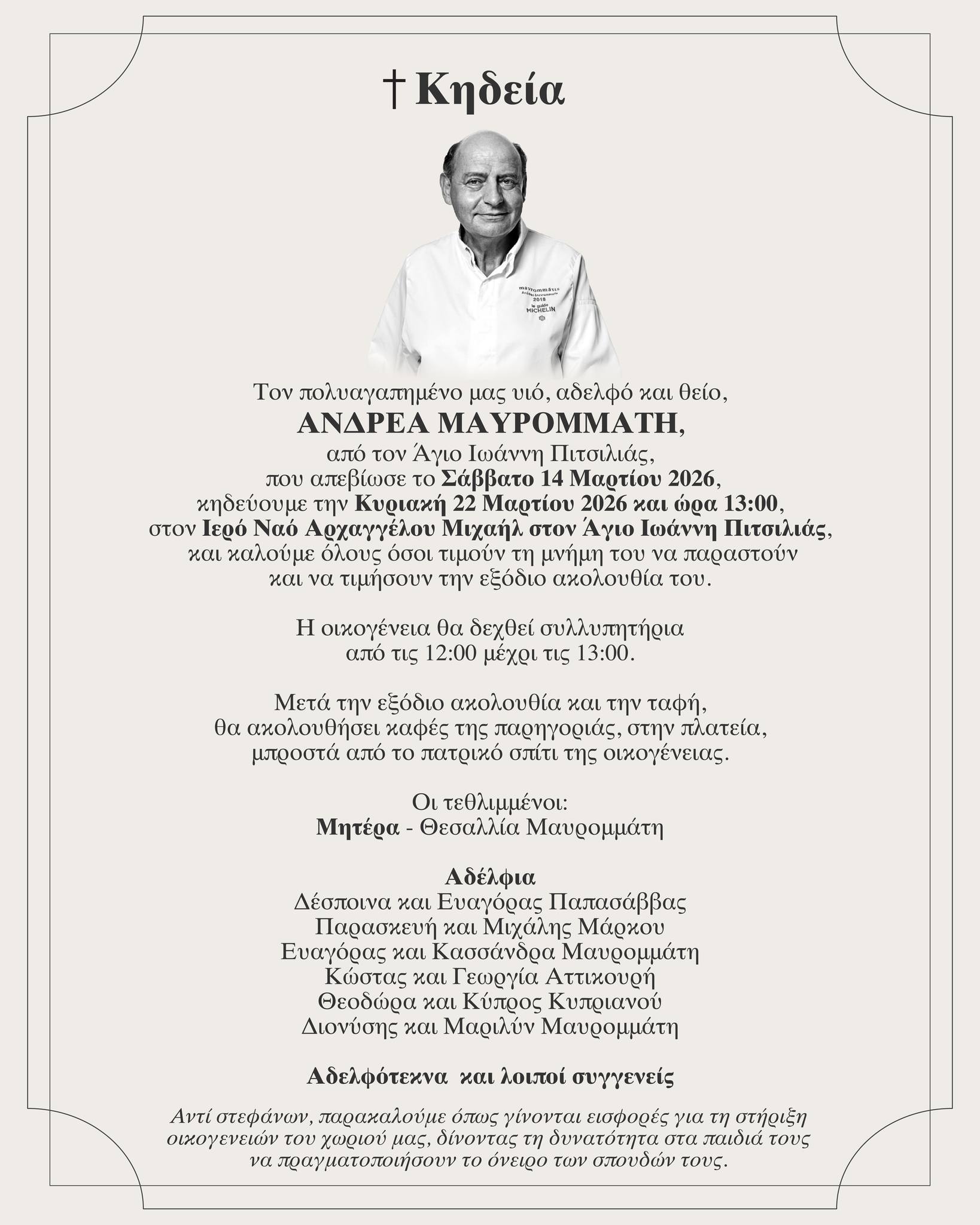 Το έργο και η προσφορά του θα συνεχιστούν μέσω των εισφορών που θα γίνουν αντί στεφάνων στην εξόδιο ακολουθία, στηρίζοντας τα όνειρα των παιδιών της κοινότητας που επιθυμούν να σπουδάσουν. Η εξόδιος ακολουθία θα τελεστεί την Κυριακή 22 Μαρτίου, στις 13:00, στον Ιερό Ναό Αρχαγγέλου Μιχαήλ στον Άγιο Ιωάννη Πιτσιλιάς, ενώ η οικογένεια θα δέχεται συλλυπητήρια από τις 12:00 έως τις 13:00.