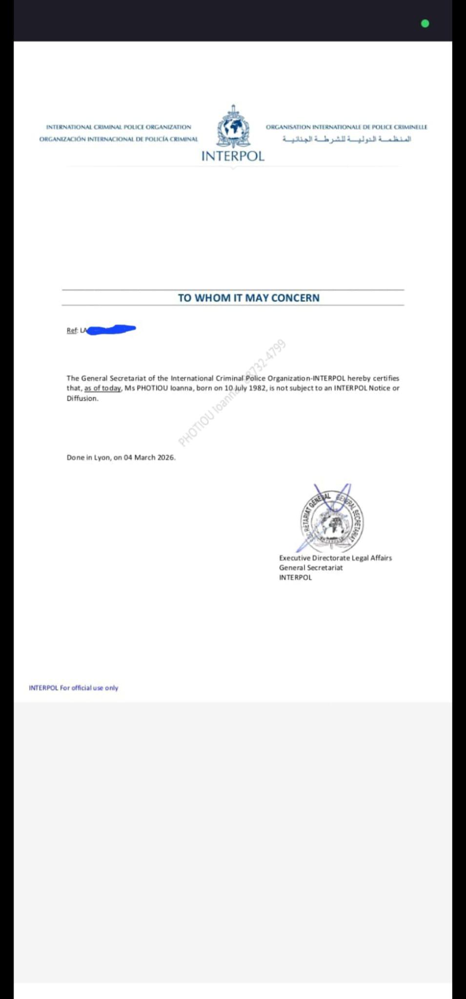 Η Κεντρική Γραμματεία της Interpol επιβεβαιώνει ότι η ΙΩΑΝΝΑ ΦΩΤΙΟΥ, γεννημένη στις 10 Ιουλίου 1982, δεν υπόκειται σε διεθνή προειδοποίηση τύπου Diffusion, η οποία αφορά επικοινωνία με αστυνομικές αρχές άλλων χωρών για εντοπισμό ή παρακολούθηση ατόμου και δεν ισοδυναμεί με ένταλμα σύλληψης ή αθώωση