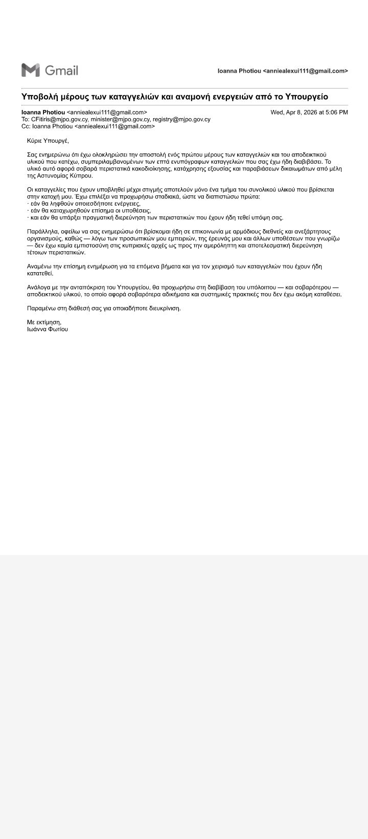Τα στοιχεία αφορούν εφτά διαφορετικές καταγγελίες για εφτά Αστυνομικούς, τις οποίες χαρακτηρίζει «απλές» και εύκολες για διερεύνηση. Η ίδια επισημαίνει ότι τουλάχιστον θα ανέμενε μια επιβεβαίωση παραλαβής των εγγράφων.