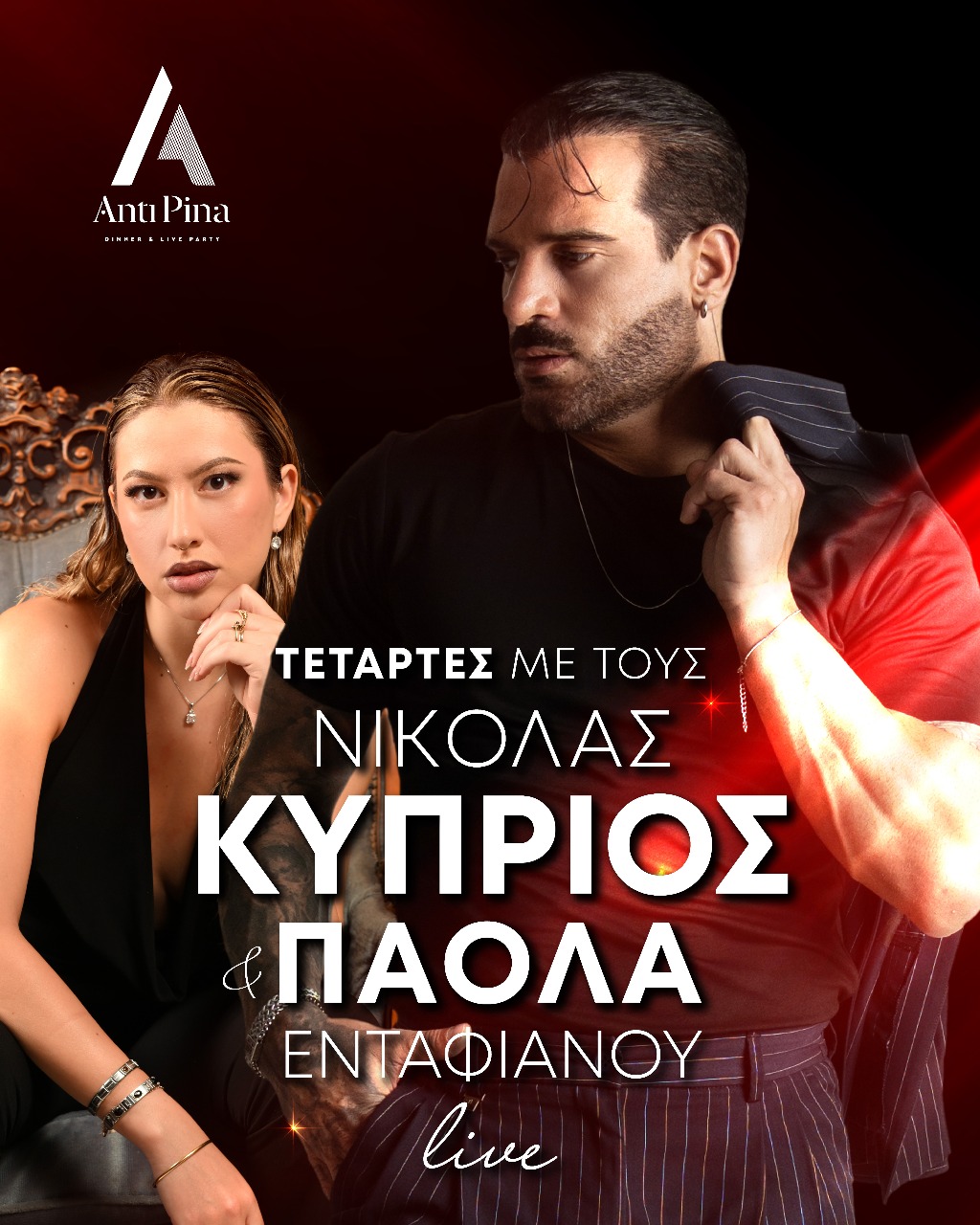 Με νέο concept, κομψό χώρο και ατμόσφαιρα που «γράφει», το υπόσχεται εμπειρίες που συνδυάζουν εκλεπτυσμένη γαστρονομία και εκρηκτική ζωντανή διασκέδαση. Από την Τετάρτη 19 Νοεμβρίου, ο Νικόλας Κύπριος αναλαμβάνει τη σκηνή, μετατρέποντας το Antipina σε μια μουσική σκηνή γεμάτη ρυθμό, ενέργεια και στυλ. Με τη χαρακτηριστική του παρουσία και τη θετική του αύρα, ο αγαπημένος καλλιτέχνης παρασύρει το κοινό σε βραδιές γεμάτες κέφι, τραγούδι και συναίσθημα. Στο πλευρό του η Πάολα Ενταφιανού, με φωνή και ενέργεια που μαγνητίζει, δημιουργεί την απόλυτη μουσική χημεία πάνω στη σκηνή.