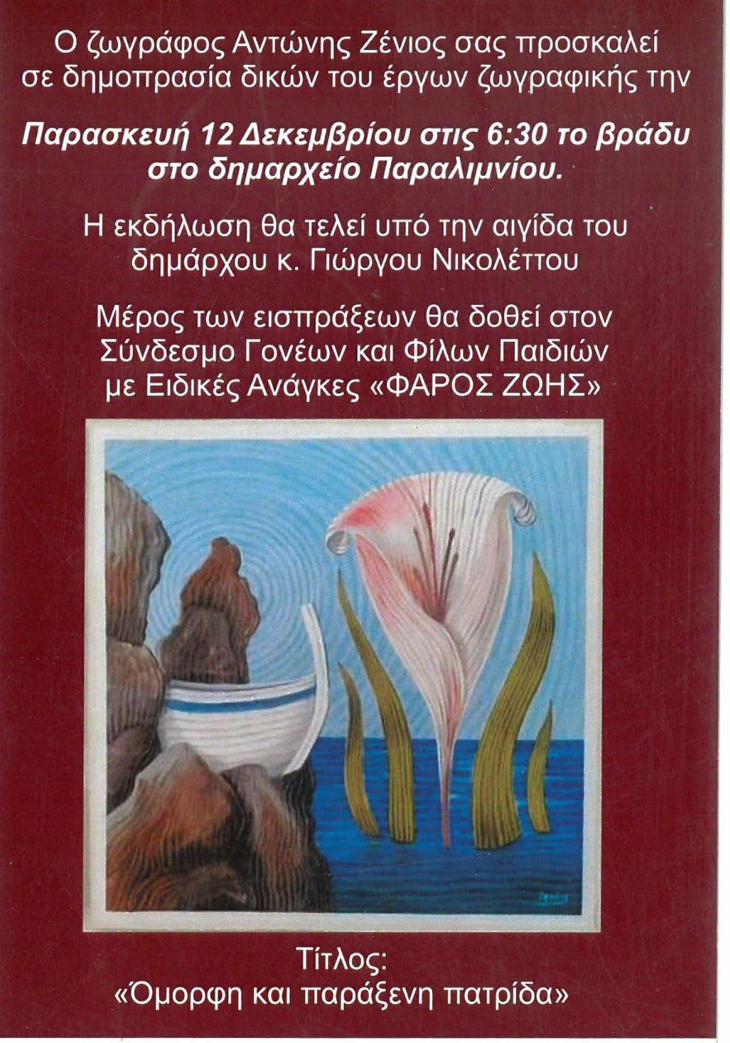 Ο Κύπριος ζωγράφος και γλύπτης Αντώνης Ζένιος, με πλούσιο καλλιτεχνικό έργο και πολλές εκθέσεις στο ενεργητικό του, θα παρουσιάσει τα έργα του σε δημοπρασία. Η παρουσίαση θα πραγματοποιηθεί στο Πολιτιστικό Κέντρο του Δημαρχείου Παραλιμνίου την Πέμπτη 12 Δεκεμβρίου 2025, στις 18:30, με τίτλο έκθεσης «Όμορφη και παράξενη πατρίδα».Η εκδήλωση τελεί υπό την αιγίδα του Δημάρχου Παραλιμνίου, κ. Γιώργου Νικολέττου, και μέρος των εισπράξεων θα διατεθεί στον Σύνδεσμο Γονέων και Φίλων Παιδιών με Ειδικές Ανάγκες «Φάρος Ζωής», συνδυάζοντας την τέχνη με την κοινωνική προσφορά.