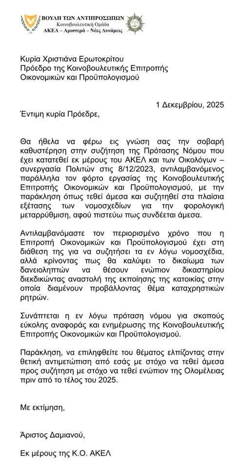Επιστολή προς την πρόεδρο της Κοινοβουλευτικής Επιτροπής Οικονομικών και Προϋπολογισμού, Χριστιάνα Ερωτοκρίτου, απέστειλε ο βουλευτής του ΑΚΕΛ Άριστος Δαμιανού, ζητώντας την επαναφορά προς συζήτηση στην Επιτροπή της Πρότασης Νόμου που κατατέθηκε από το 2023, με στόχο την προστασία των δανειοληπτών.