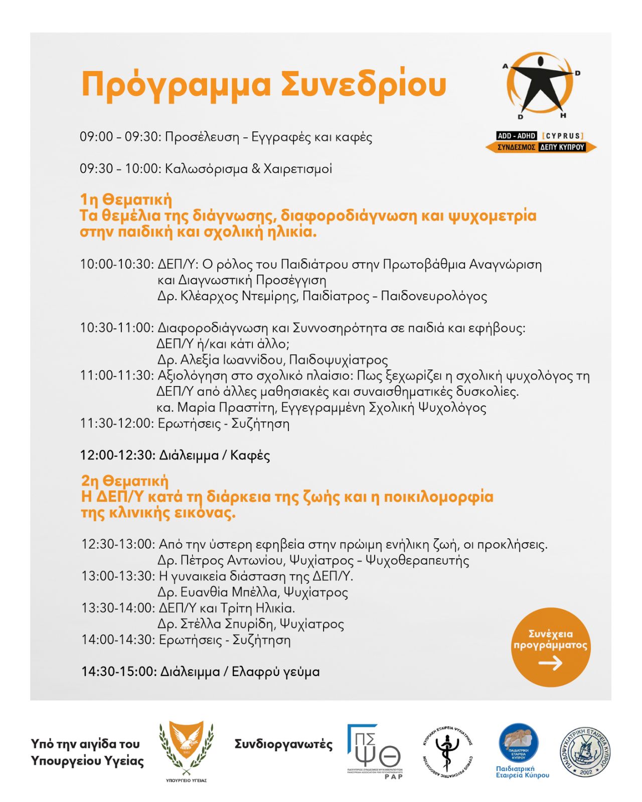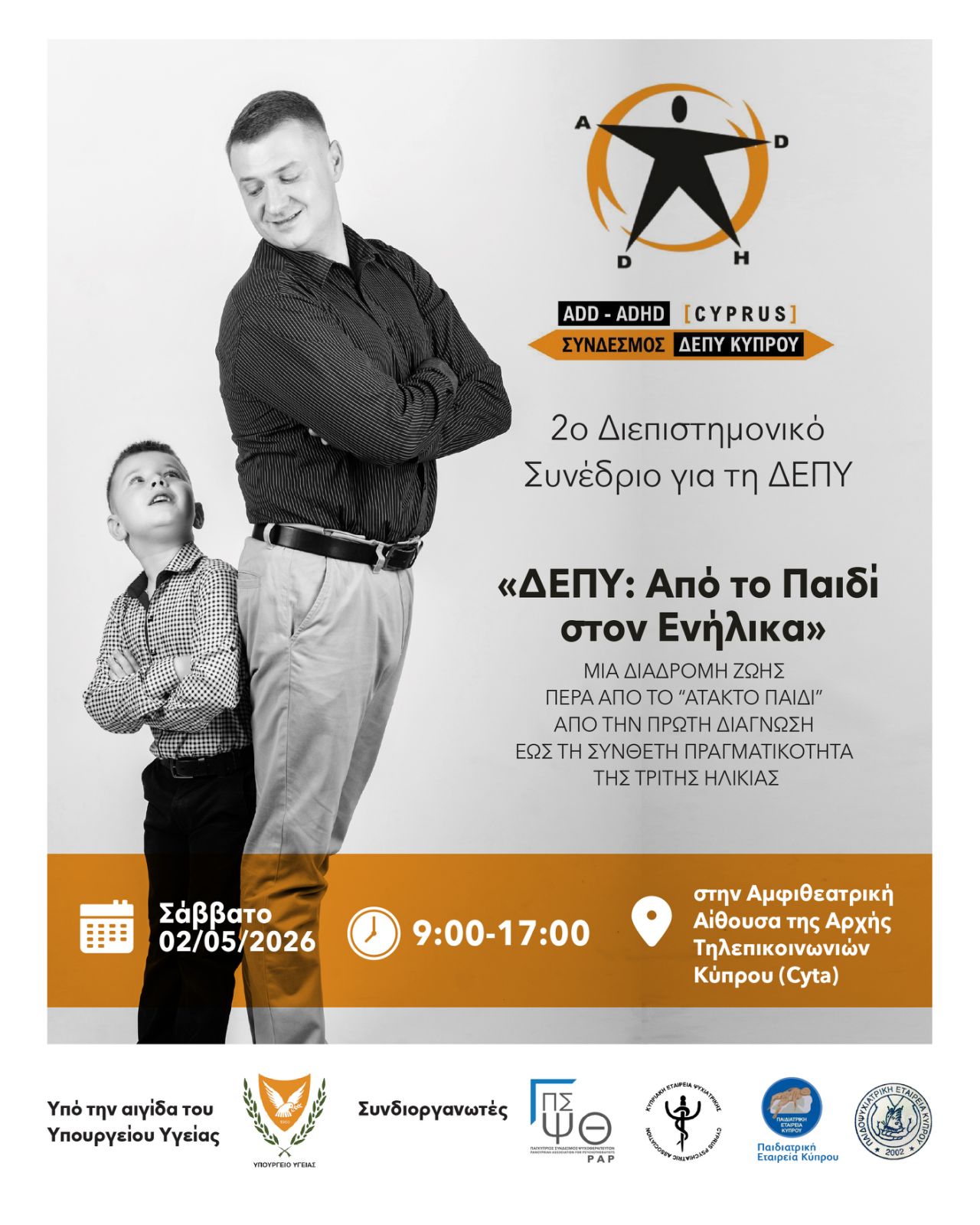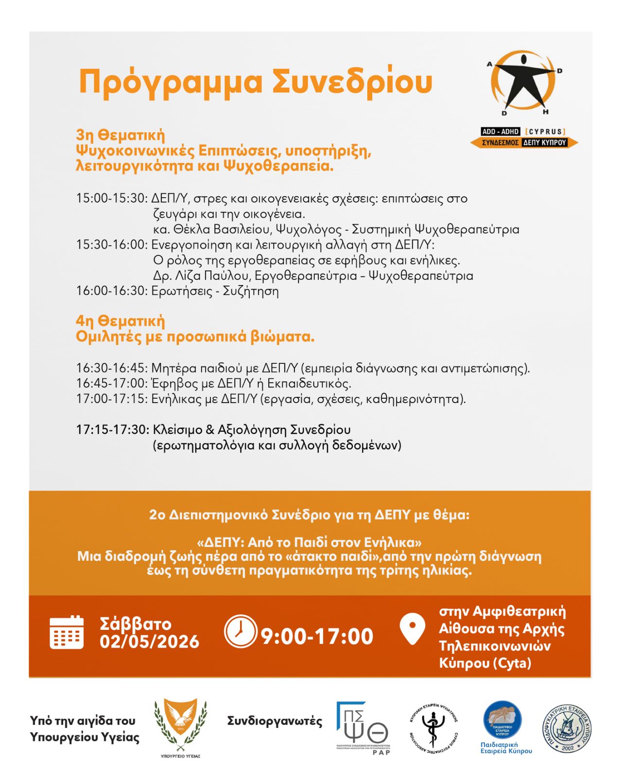 Το συνέδριο θα πραγματοποιηθεί το Σάββατο 2 Μαΐου 2026 διεπιστημονικό συνέδριο με θέμα «ΔΕΠΥ: Από το Παιδί στον Ενήλικα» από τις 09:00 έως τις 17:00 στην Αμφιθεατρική Αίθουσα της Αρχής Τηλεπικοινωνιών Κύπρου (Cyta), συγκεντρώνοντας επαγγελματίες από διαφορετικούς επιστημονικούς τομείς.