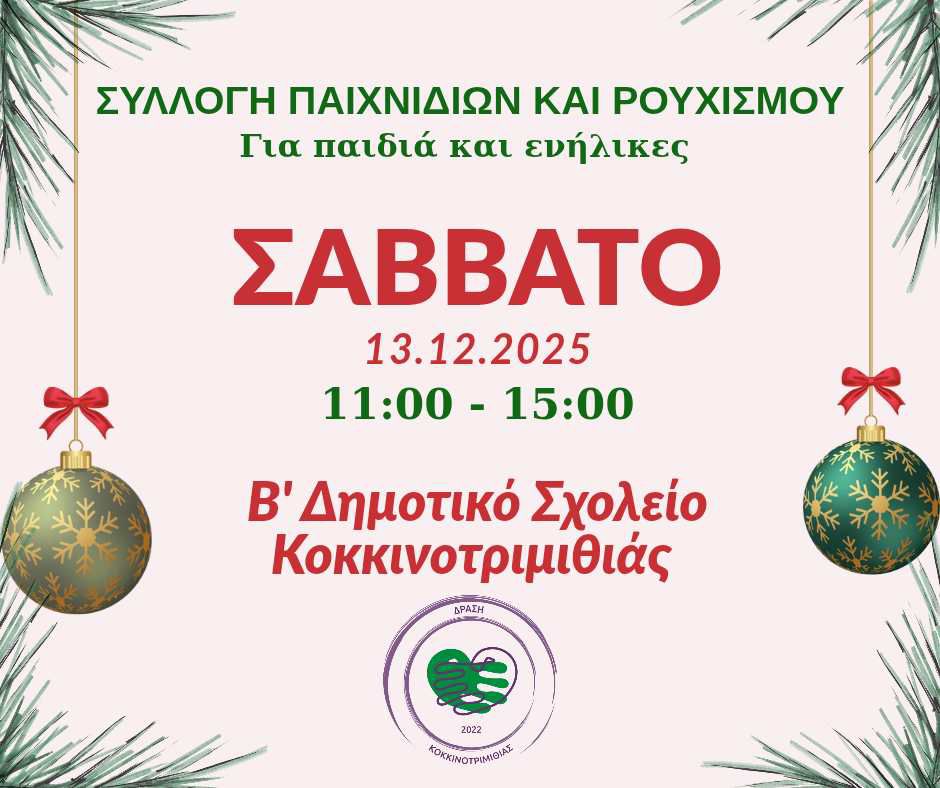 Συγκεκριμένα, το Β’ Δημοτικό Σχολείο Κοκκινοτριμιθιάς διοργανώνει το Σάββατο, 13 Δεκεμβρίου 2025, από τις 11:00 μέχρι τις 15:00, μια δράση συλλογής παιχνιδιών και ρουχισμού για παιδιά και ενήλικες. Μέσα στο χριστουγεννιάτικο κλίμα, η εκδήλωση καλεί τον κόσμο να ανοίξει την καρδιά του και να προσφέρει ό,τι μπορεί – γιατί τελικά, αυτή είναι και η ουσία των γιορτών να μοιραζόμαστε, να φροντίζουμε και να στηρίζουμε όσους έχουν ανάγκη. Μικρά ή μεγάλα δώρα, παιχνίδια που δεν χρησιμοποιούνται πια, ζεστά ρούχα σε καλή κατάσταση — κάθε προσφορά μπορεί να γίνει η σπίθα που φωτίζει το χαμόγελο κάποιου άλλου.