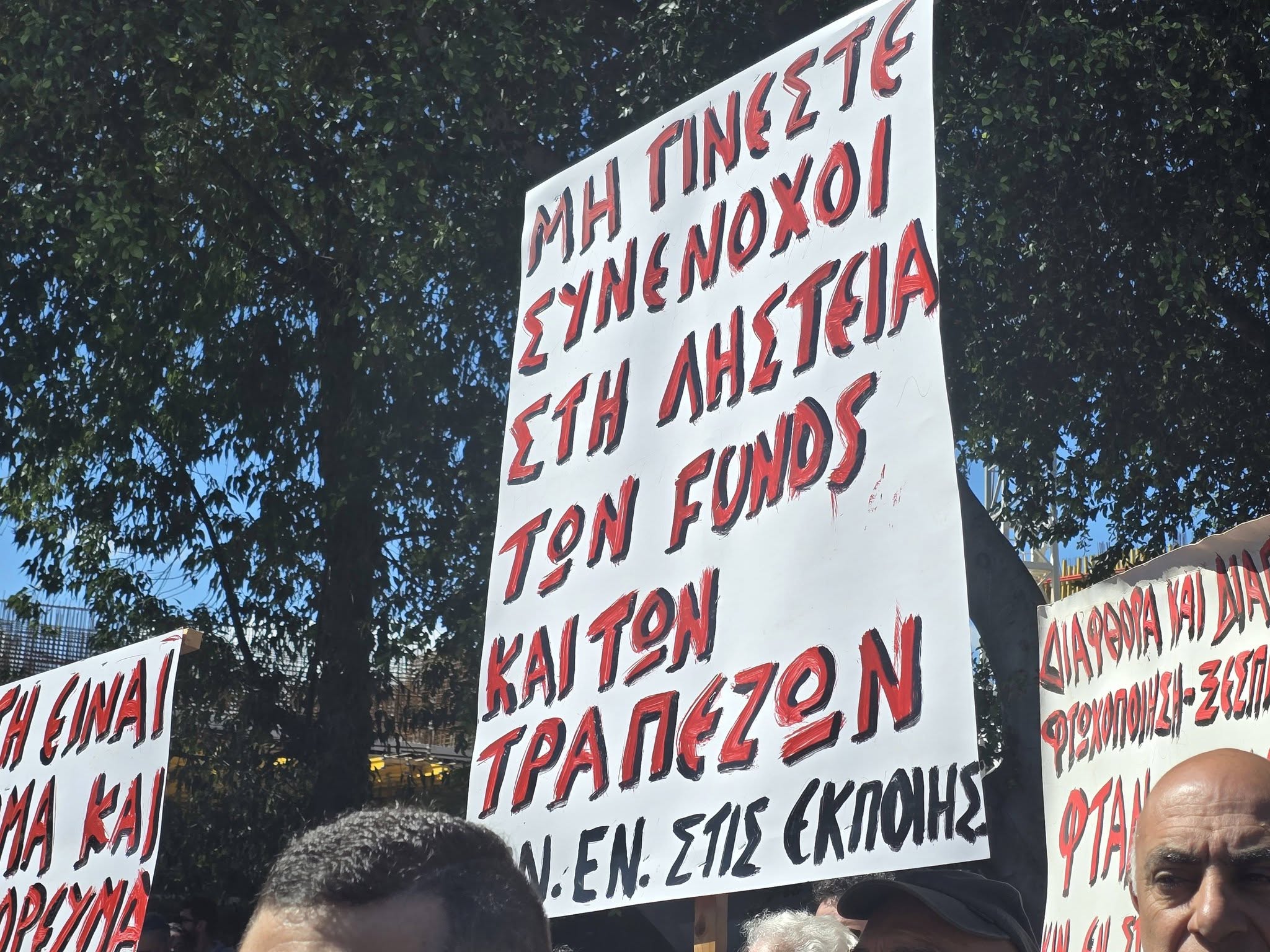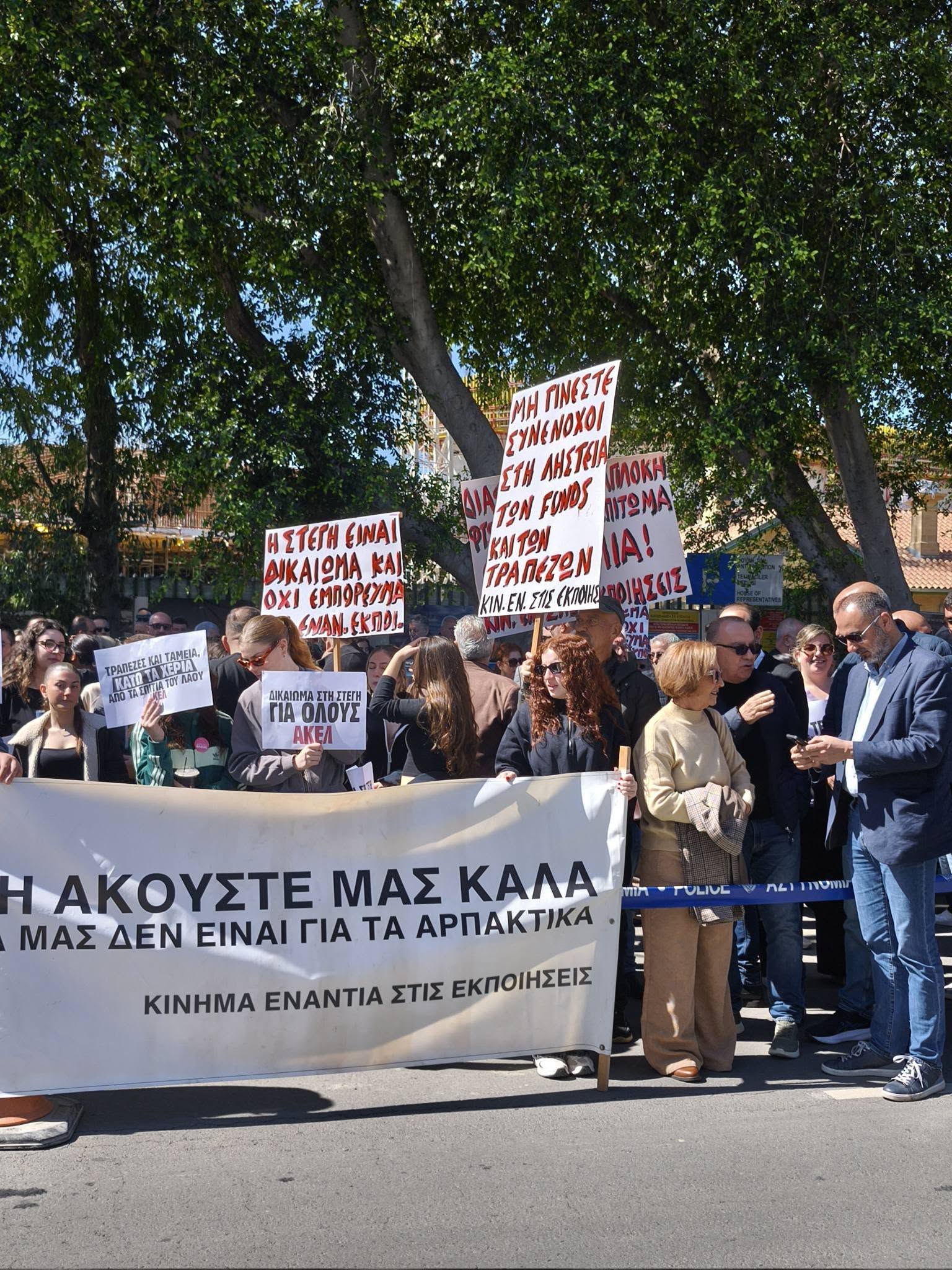 Με πανό και πλακάτ στα χέρια, οι διαμαρτυρόμενοι εκφράζουν την αγωνία και την αντίθεσή τους, ζητώντας να μπει τέλος στις εκποιήσεις πρώτης κατοικίας. Τα συνθήματα που ακούγονται αποτυπώνουν τη φόρτιση της στιγμής, αλλά και την ανάγκη για άμεσες λύσεις που θα προστατεύουν τους δανειολήπτες και τις οικογένειές τους.