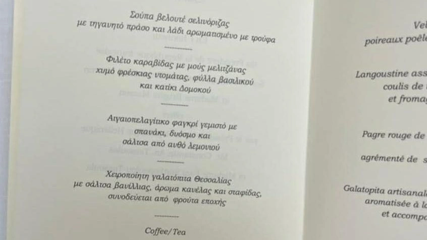 Το δείπνο που παρατέθηκε προς τιμήν του είχε έντονο ελληνικό χαρακτήρα, με σύγχρονες γαστρονομικές πινελιές. Το μενού περιλάμβανε, μεταξύ άλλων, βελουτέ σελινόριζας με άρωμα τρούφας, φιλέτο καραβίδας με μους μελιτζάνας, φαγκρί γεμιστό με σπανάκι και δυόσμο, ενώ το επιδόρπιο ήταν παραδοσιακή γαλατόπιτα Θεσσαλίας.
