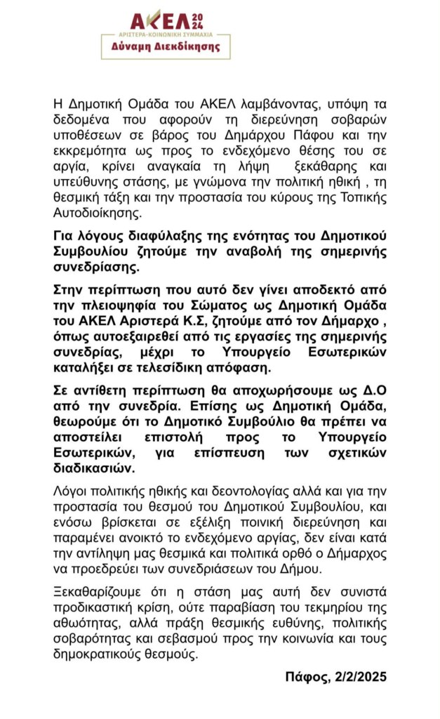 Το ΑΚΕΛ τόνισε ότι, ενόψει της διερεύνησης σοβαρών υποθέσεων σε βάρος του Δημάρχου Φαίδωνα Φαίδωνος, κρίνεται αναγκαία η αναβολή ή, εναλλακτικά, η αυτοαπομάκρυνση του Δημάρχου από τη σημερινή συνεδρία, μέχρι να αποφανθεί το Υπουργείο Εσωτερικών για ενδεχόμενη αργία του.