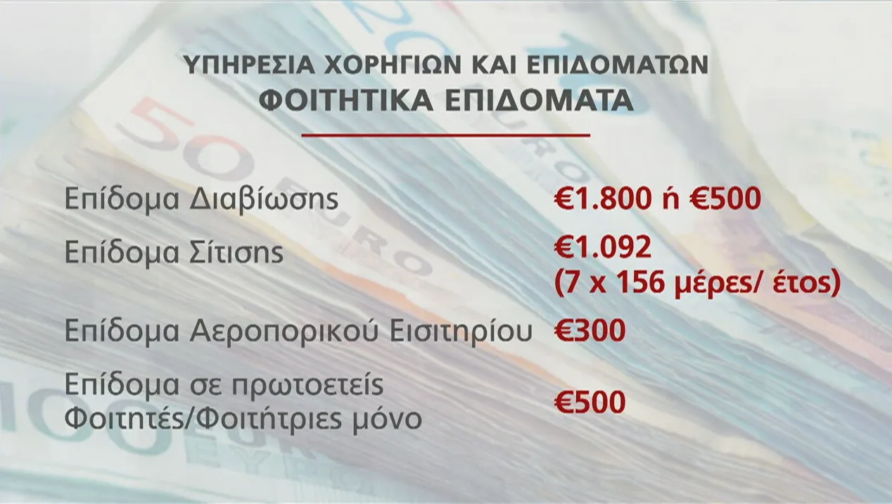 Το επίδομα διαβίωσης κυμαίνεται από 500 έως 1.800 ευρώ και καθορίζεται με βάση τα μόρια που συγκεντρώνει κάθε φοιτητής. Το επίδομα σίτισης ανέρχεται στα 1.092 ευρώ, ενώ το επίδομα αεροπορικού εισιτηρίου αυξήθηκε από 200 σε 300 ευρώ μετά από αίτημα των φοιτητικών οργανώσεων. Επιπλέον, οι πρωτοετείς φοιτητές και φοιτήτριες δικαιούνται ειδικό επίδομα ύψους 500 ευρώ.