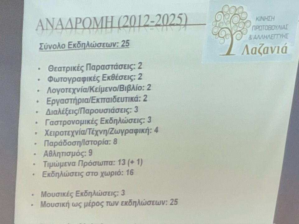 Στην εκδήλωση έγινε αναφορά στις δράσεις που έχει υλοποιήσει η «Κίνηση Πρωτοβουλίας και Αλληλεγγύης Λαζανιά» από την ίδρυσή της μέχρι σήμερα, αλλά και σε όσα πραγματοποιήθηκαν από το 2012 και μετά. Πρόκειται για παρεμβάσεις που άφησαν αποτύπωμα στην κοινότητα, επιβεβαιώνοντας ότι όταν οι άνθρωποι οργανώνονται, τα μικρά χωριά αποκτούν φωνή, ζωή και προοπτική.