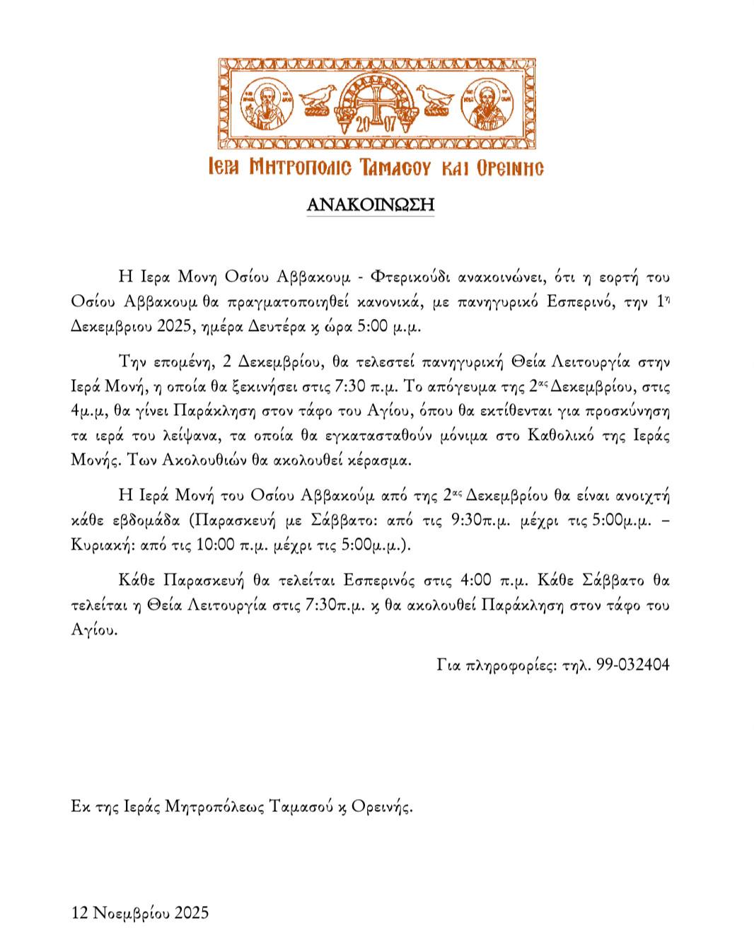 Η Ιερά Μονή Οσίου Αββακούμ – Φτερικουδίου ανακοινώνει ότι η εορτή του Οσίου θα πραγματοποιηθεί κανονικά, με πανηγυρικό Εσπερινό τη Δευτέρα, 1η Δεκεμβρίου 2025, και ώρα 5:00 μ.μ. Την επομένη, Τρίτη, 2 Δεκεμβρίου, θα τελεστεί πανηγυρική Θεία Λειτουργία στην Ιερά Μονή, η οποία θα ξεκινήσει στις 7:30 π.μ. Το απόγευμα της ίδιας ημέρας, στις 4:00 μ.μ., θα τελεστεί Παράκληση στον τάφο του Αγίου, όπου θα εκτίθενται για προσκύνηση τα Ιερά του Λείψανα, τα οποία θα εγκατασταθούν μόνιμα στο Καθολικό της Μονής. Των Ιερών Ακολουθιών θα ακολουθεί κέρασμα.