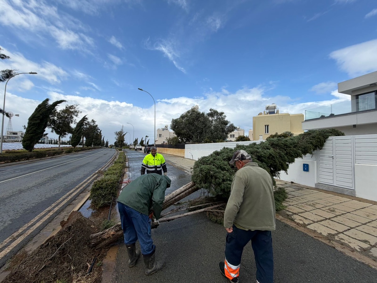 Την ίδια ώρα, η κακοκαιρία προκάλεσε σοβαρές ζημιές και στον αγροτικό κόσμο. Στην ελεύθερη επαρχία Αμμοχώστου ισχυροί άνεμοι κατέστρεψαν θερμοκήπια και καλλιέργειες, με παραγωγούς να κάνουν λόγο για μεγάλες απώλειες μέσα σε λίγα μόλις λεπτά. Παρεμβάσεις έγιναν και από τα συνεργεία του Δήμου Παραλιμνίου – Δερύνειας, τα οποία από νωρίς το πρωί βρέθηκαν σε διάφορα σημεία του οδικού δικτύου για απομάκρυνση πεσμένων δέντρων και αποκατάσταση της κυκλοφορίας.