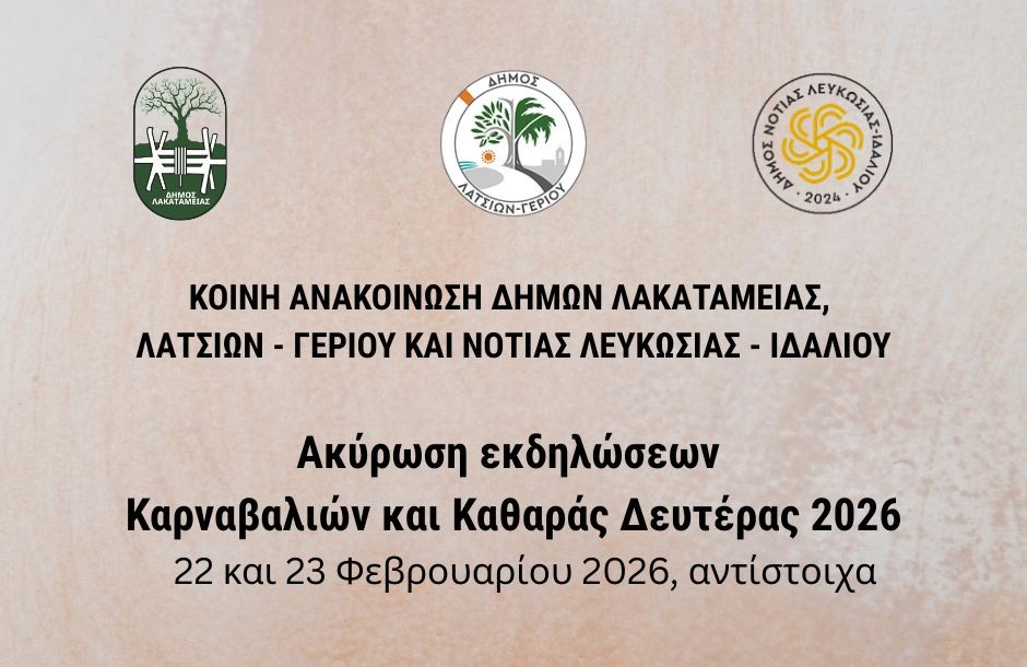 Σε κοινή ανακοίνωση που εξέδωσαν ο Δήμος Λακατάμειας, ο Δήμος Λατσιών – Γερίου και ο Δήμος Νότιας Λευκωσίας – Ιδαλίου, γνωστοποιείται η ακύρωση όλων των προγραμματισμένων εκδηλώσεων για τα Καρναβάλια και την Καθαρά Δευτέρα 2026, οι οποίες επρόκειτο να πραγματοποιηθούν στις 22 και 23 Φεβρουαρίου αντίστοιχα.