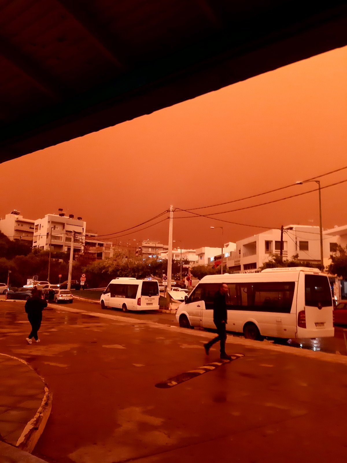 Στην Αττική ο ουρανός έγινε επίσης πορτοκαλί‑κόκκινος στην Αττική, με την αφρικανική σκόνη να καλύπτει τον ουρανό, περιορίζοντας την ορατότητα ακόμα και στο κέντρο της Αθήνας και κάνοντας την ατμόσφαιρα να μοιάζει πιο «βαριά».