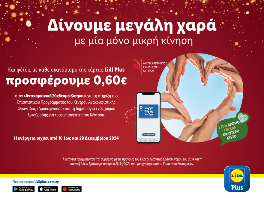 Αυτές τις γιορτινές μέρες, η Lidl Κύπρου συνεχίζει να στέκεται στο πλευρό των συνανθρώπων μας, ενισχύοντας το πολύτιμο έργο του Αντικαρκινικού Συνδέσμου Κύπρου.