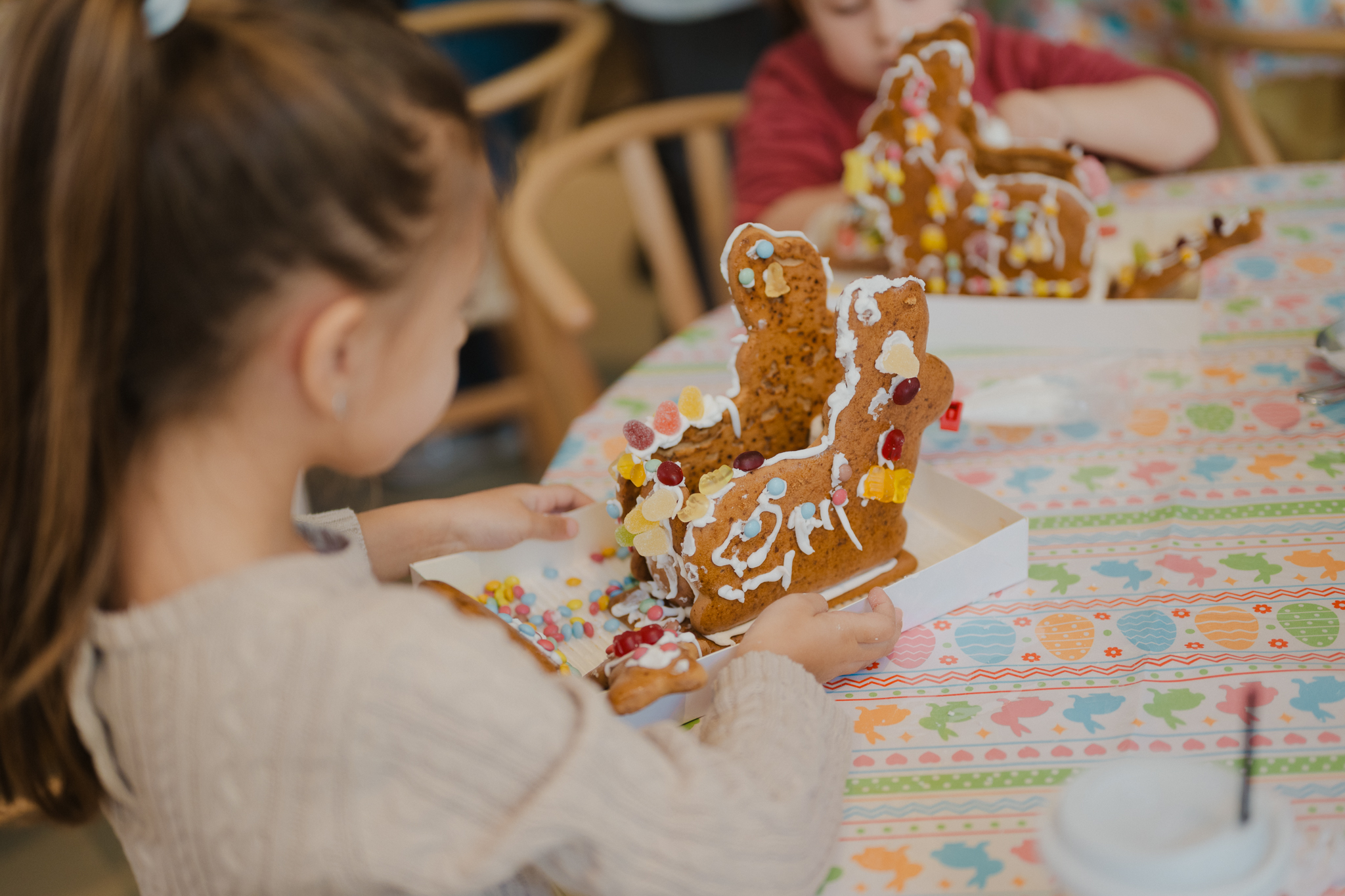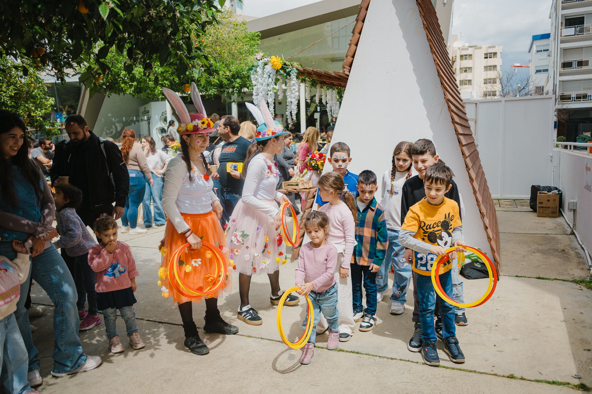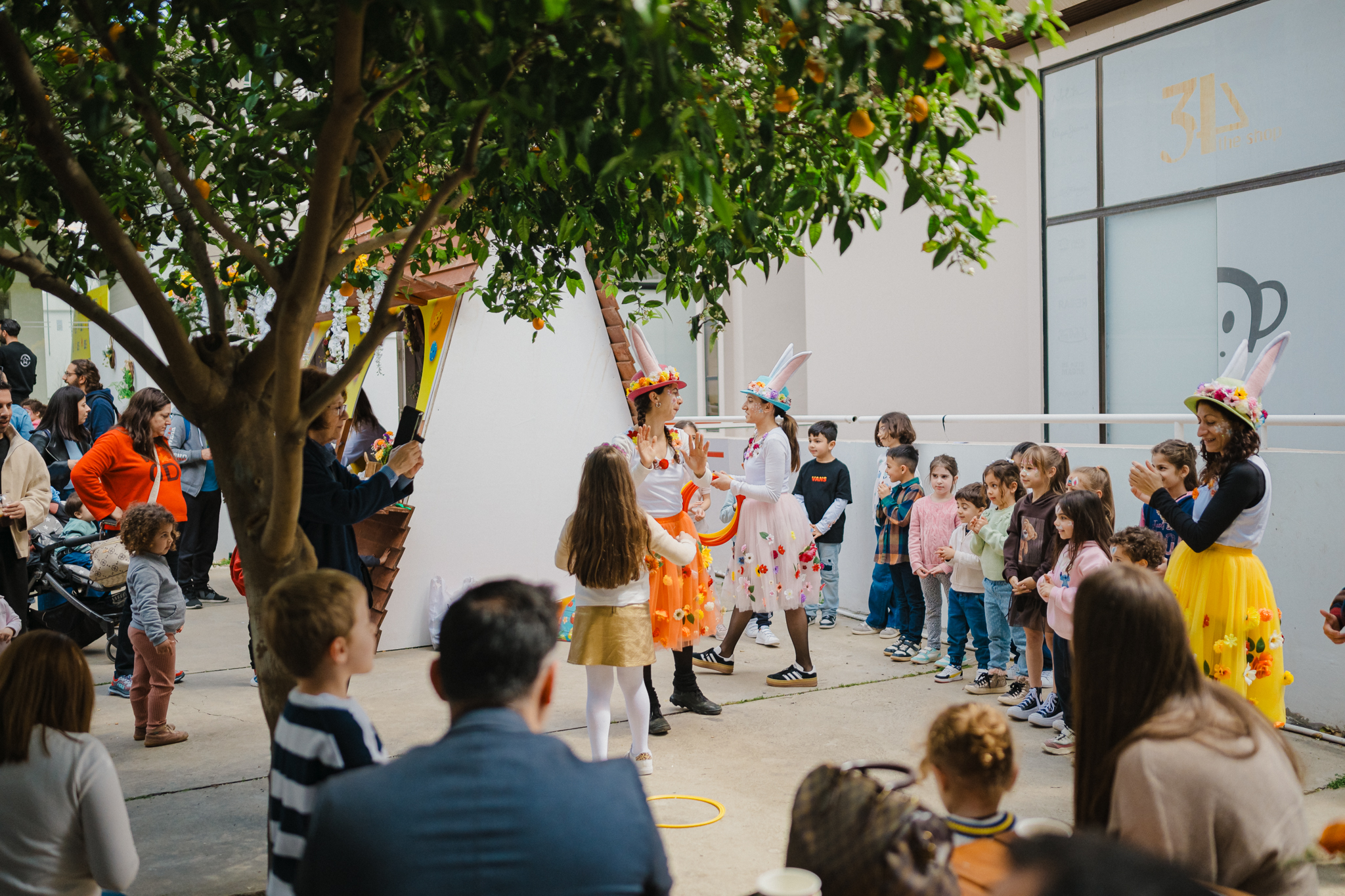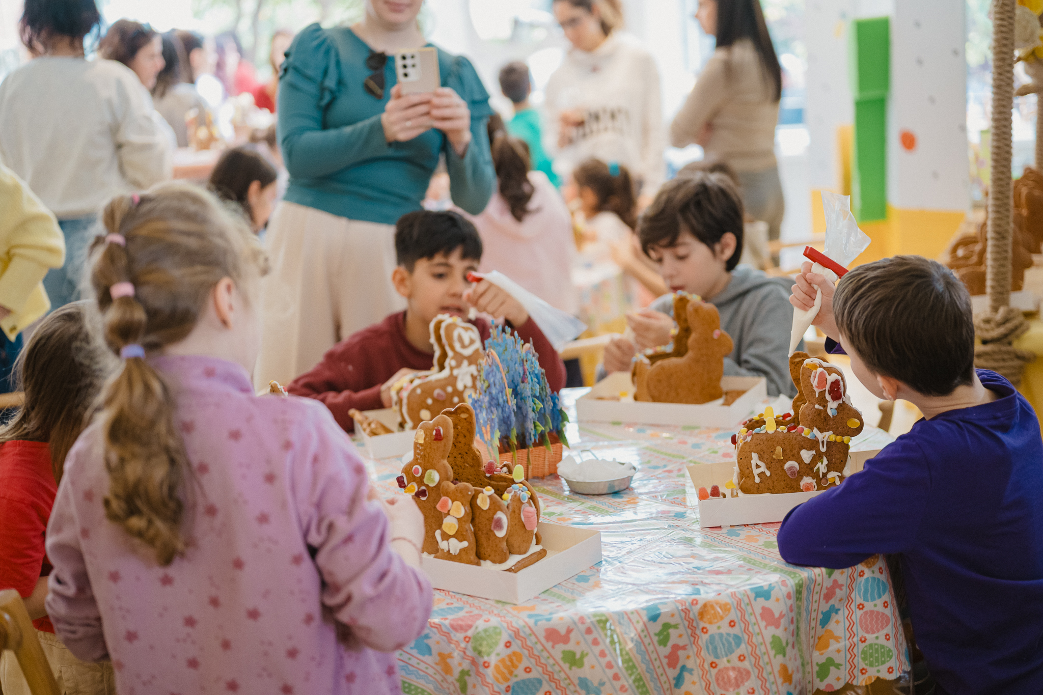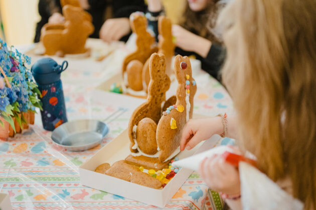 Οι μυρωδιές από φρέσκες φλαούνες και παραδοσιακά κουλουράκια σε υποδέχονταν πριν καν φτάσεις στην είσοδο. Η ζύμη ήταν ήδη έτοιμη και περίμενε τα παιδιά να τη δοκιμάσουν, να τη δουλέψουν με τα χέρια τους και να πάρουν μια πρώτη γεύση από το πώς φτιάχνονται όλα αυτά τα πασχαλινά εδέσματα — φλαούνες, τσουρέκια, σοκολατάκια. Κάτι που, όπως φάνηκε, τα ενθουσίασε ιδιαίτερα. Λίγο πιο μέσα, ο γνώριμος Πασχαλινός αρκούδος τραβούσε τα βλέμματα, με τα παιδιά να τρέχουν να φωτογραφηθούν μαζί του, δίνοντας τον δικό τους ρυθμό στη γιορτή.