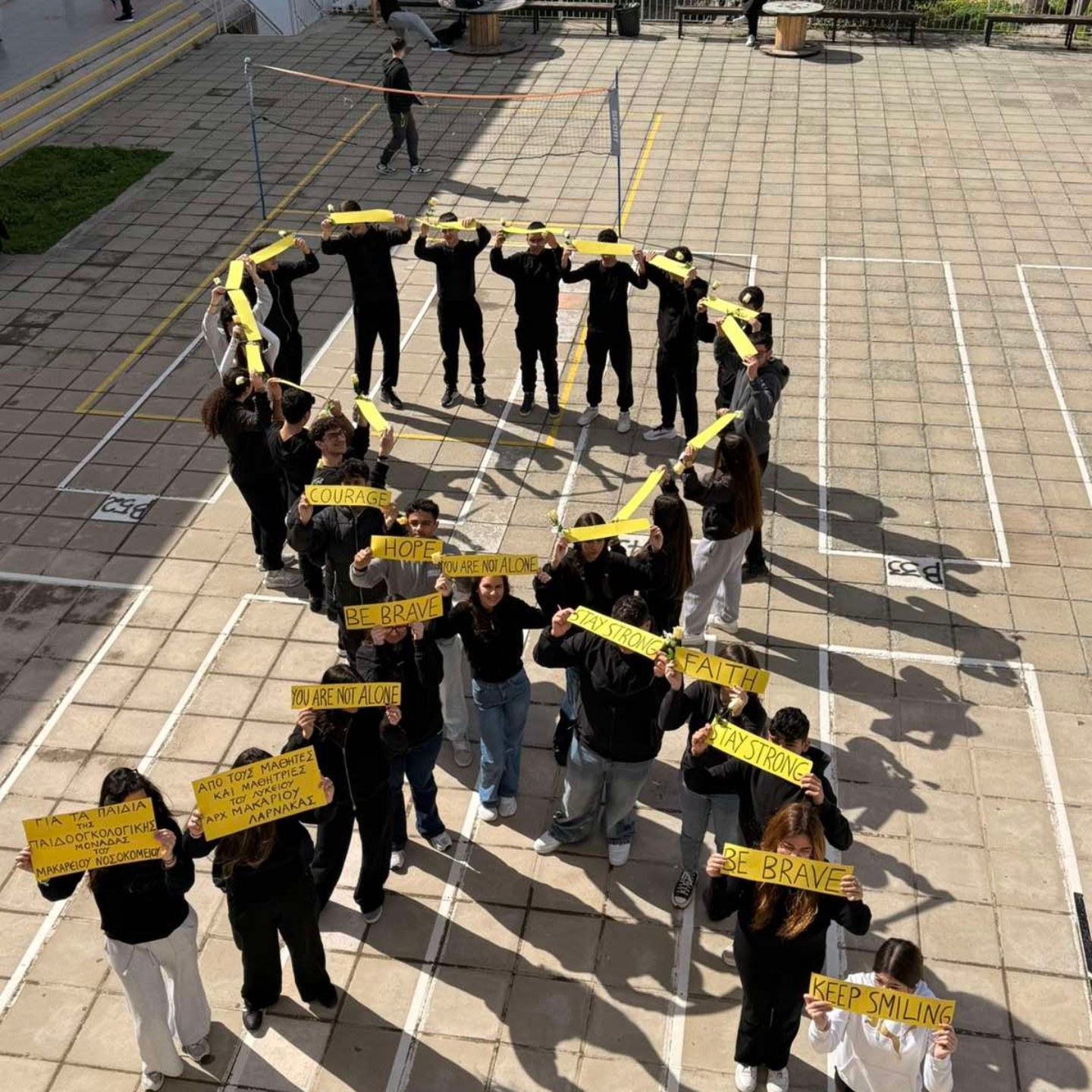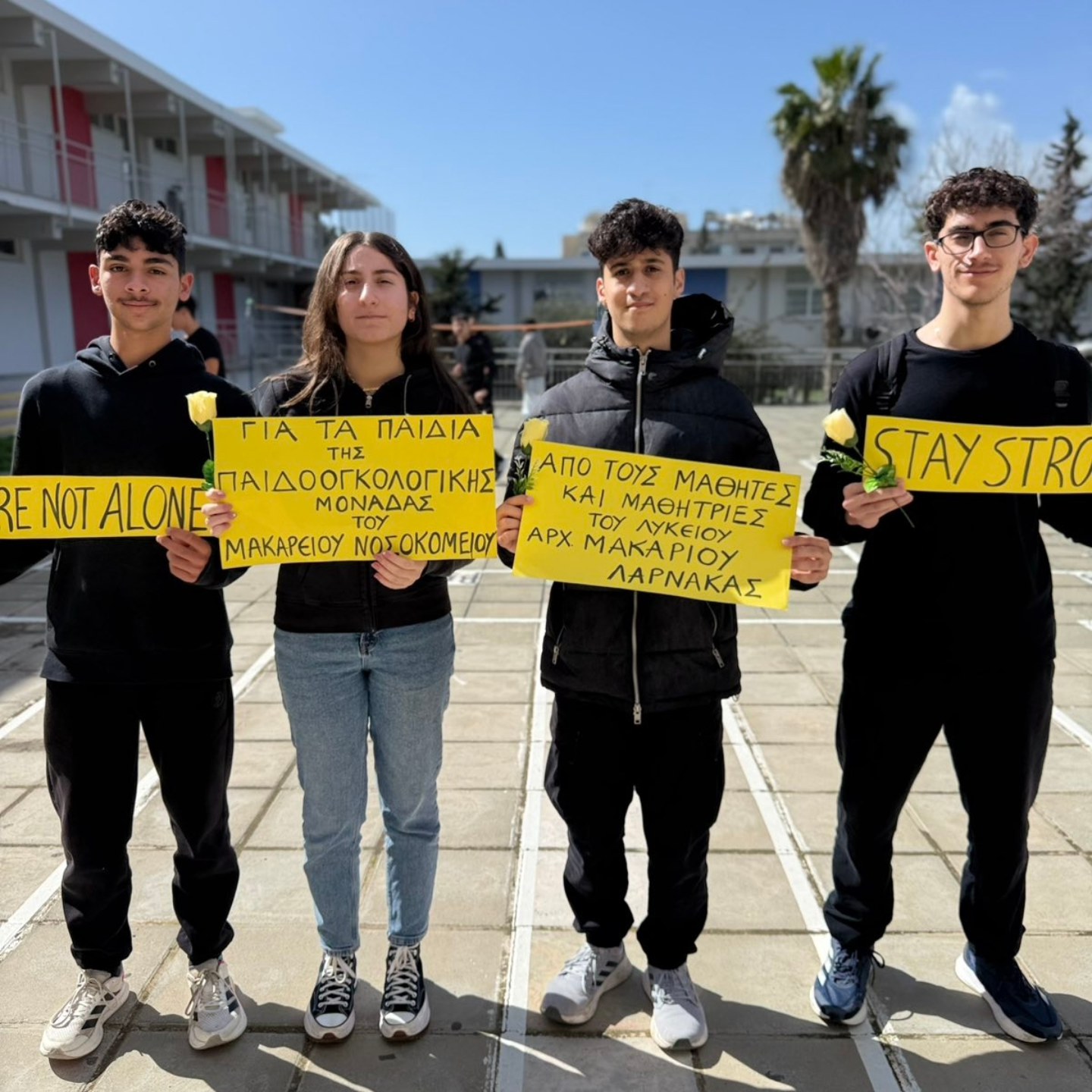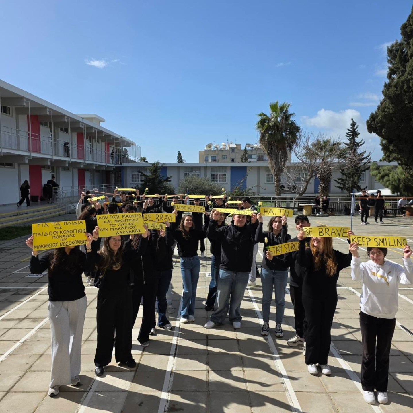 Μια όμορφη και συγκινητική πρωτοβουλία πραγματοποιήθηκε σήμερα στον προαύλιο χώρο του Λύκειο Μακαρίου Γ΄ Λάρνακας, από εκπαιδευτικούς και μαθητές, οι οποίοι έστειλαν το δικό τους μήνυμα συμπαράστασης προς τα παιδιά που δίνουν μάχη με τον καρκίνο.
