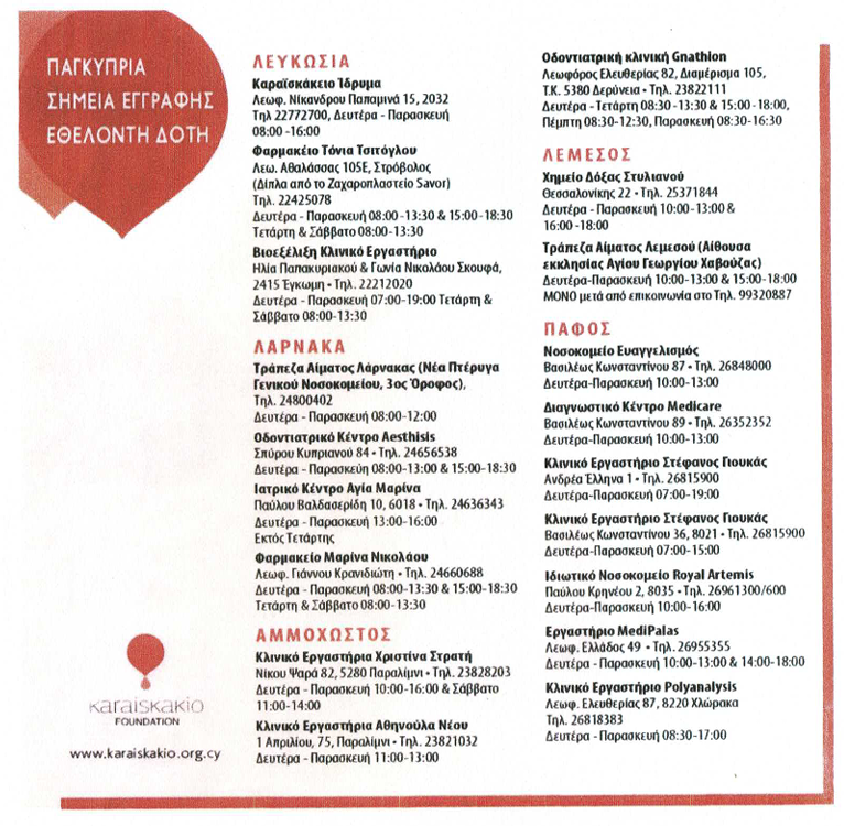 Όσοι ενδιαφέρονται μπορούν να αποταθούν στο Καραϊσκάκειο Ίδρυμα, στις Τράπεζες Αίματος των δημόσιων νοσοκομείων, καθώς και σε συνεργαζόμενα ιατρικά, διαγνωστικά και οδοντιατρικά κέντρα σε όλες τις επαρχίες: Λευκωσία, Λεμεσό, Λάρνακα, Πάφο και Αμμόχωστο.Όσοι επιθυμούν να βοηθήσουν μπορούν να αποταθούν σε συγκεκριμένα σημεία αιμοδοσίας και συνεργαζόμενα κέντρα σε όλες τις επαρχίες.