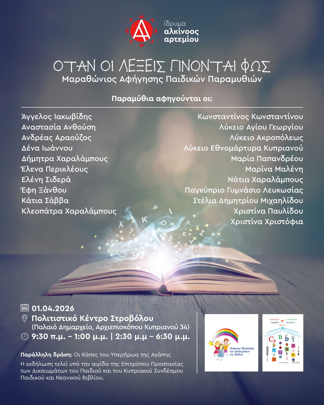 Ο Μαραθώνιος Αφήγησης διοργανώνεται θα πραγματοποιηθεί την Τετάρτη 1η Απριλίου 2026 στο Πολιτιστικό Κέντρο Στροβόλου (Παλαιό Δημαρχείο) και φιλοδοξεί να προσφέρει μια ημέρα γεμάτη ιστορίες, φαντασία και δημιουργική έκφραση για μικρούς και μεγάλους. Η εκδήλωση θα διεξαχθεί σε δύο χρονικές ενότητες, από τις 09:30 μέχρι τις 13:00 και από τις 14:30 μέχρι τις 18:30, ενώ η είσοδος για το κοινό θα είναι ελεύθερη.
