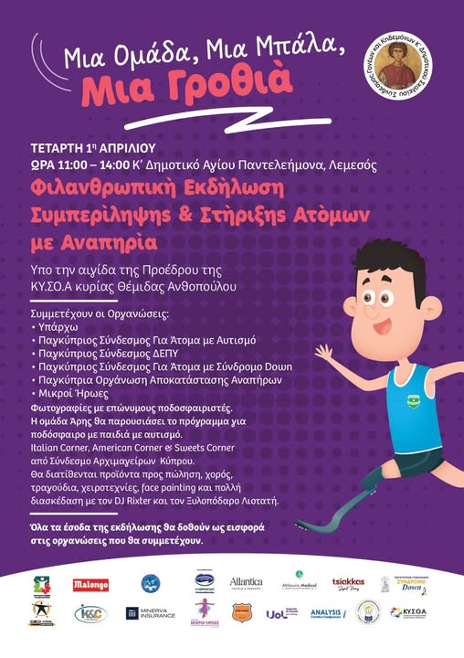 Μια όμορφη πρωτοβουλία με κοινωνικό χαρακτήρα αναλαμβάνει ο Σύνδεσμος Γονέων και Κηδεμόνων του Κ’ Δημοτικού Αγίου Παντελεήμονα στη Λεμεσό, διοργανώνοντας εκδήλωση αφιερωμένη στη συμπερίληψη και τη στήριξη των ατόμων με αναπηρία.