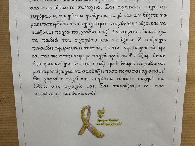 Με τη συνοδεία της δασκάλας τους, τα παιδιά δημιούργησαν ευχετήριες κάρτες και συγκέντρωσαν δώρα, στέλνοντας μηνύματα αγάπης και ελπίδας. Μέσα από τη δράση τους, μας υπενθυμίζουν ότι κάθε μέρα μπορεί να είναι «Σεπτέμβρης» – μια μέρα αφιερωμένη στην αλληλεγγύη, τη συμπαράσταση και τη φροντίδα των παιδιών που βρίσκονται στο νοσοκομείο.