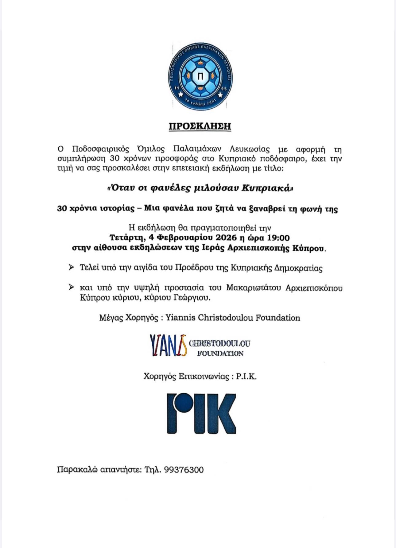 Ο Ποδοσφαιρικός Όμιλος Παλαίμαχων Λευκωσίας γιορτάζει φέτος 30 χρόνια ιστορίας, τιμώντας τη φανέλα και την παράδοση της ποδοσφαιρικής ομάδας, τότε που το ποδόσφαιρο δεν ήταν απλώς ένα άθλημα, αλλά υπόθεση σεβασμού, αλληλεγγύης και αγάπης για το παιχνίδι. Τότε που οι νεαροί ποδοσφαιριστές έδιναν την ψυχή τους στο γήπεδο και τίμησαν τη φανέλα με το ήθος τους.
