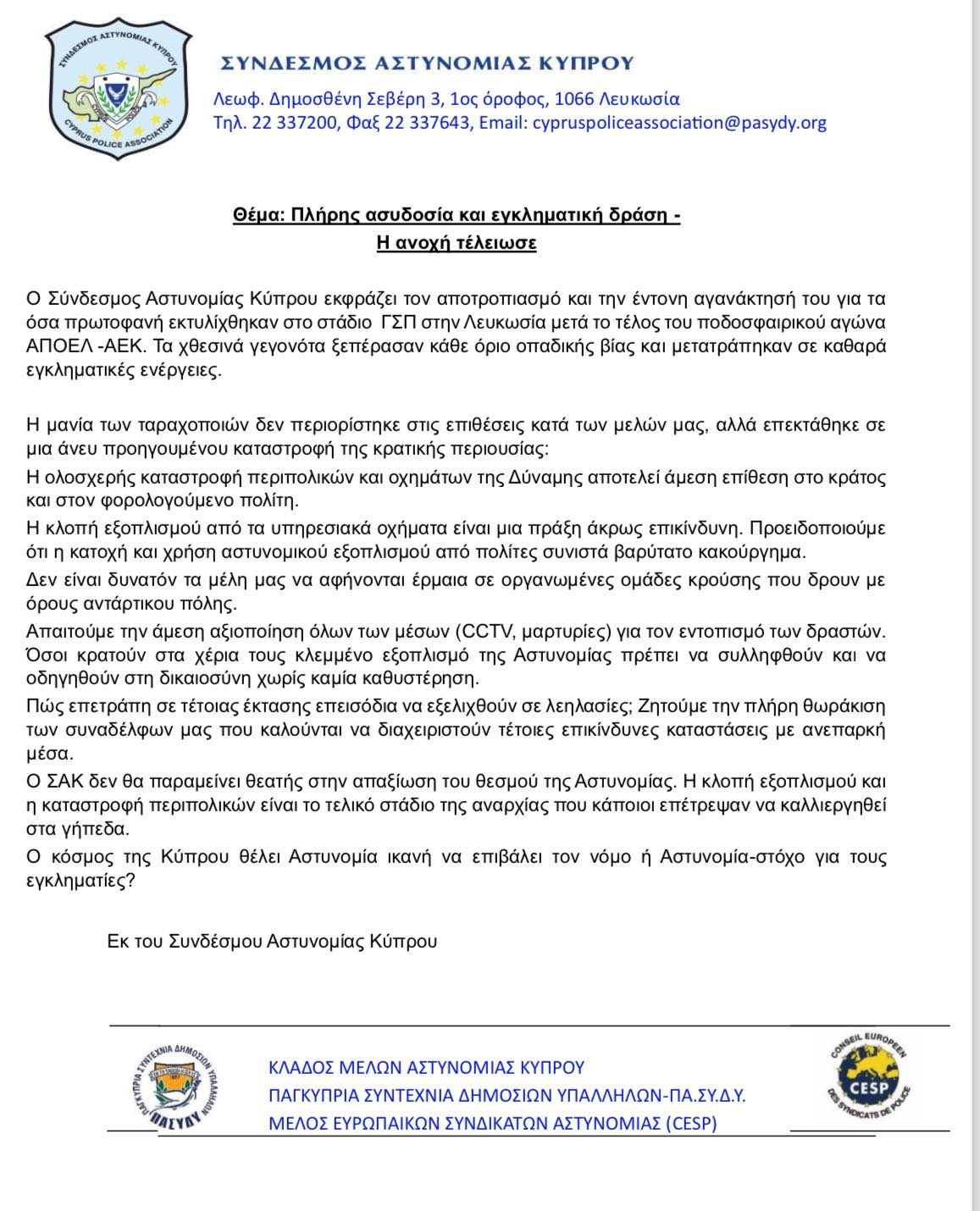 Την έντονη αγανάκτησή του για τα σοβαρά επεισόδια που σημειώθηκαν χθες στο στάδιο ΓΣΠ, μετά τον αγώνα ΑΠΟΕΛ–ΑΕΚ, εκφράζει ο Σύνδεσμος Αστυνομίας Κύπρου, όταν περίπου 150 οπαδοί του ΑΠΟΕΛ προκάλεσαν καταστροφές σε υπηρεσιακά οχήματα, έριξαν πέτρες κατά των αστυνομικών και έκλεψαν αστυνομικό εξοπλισμό.