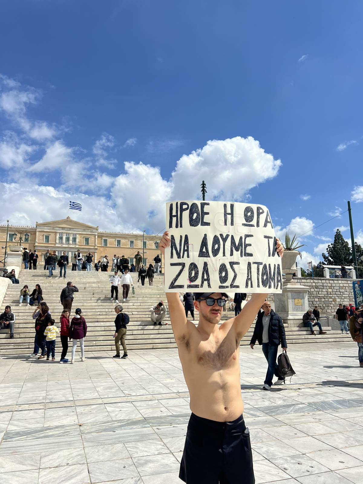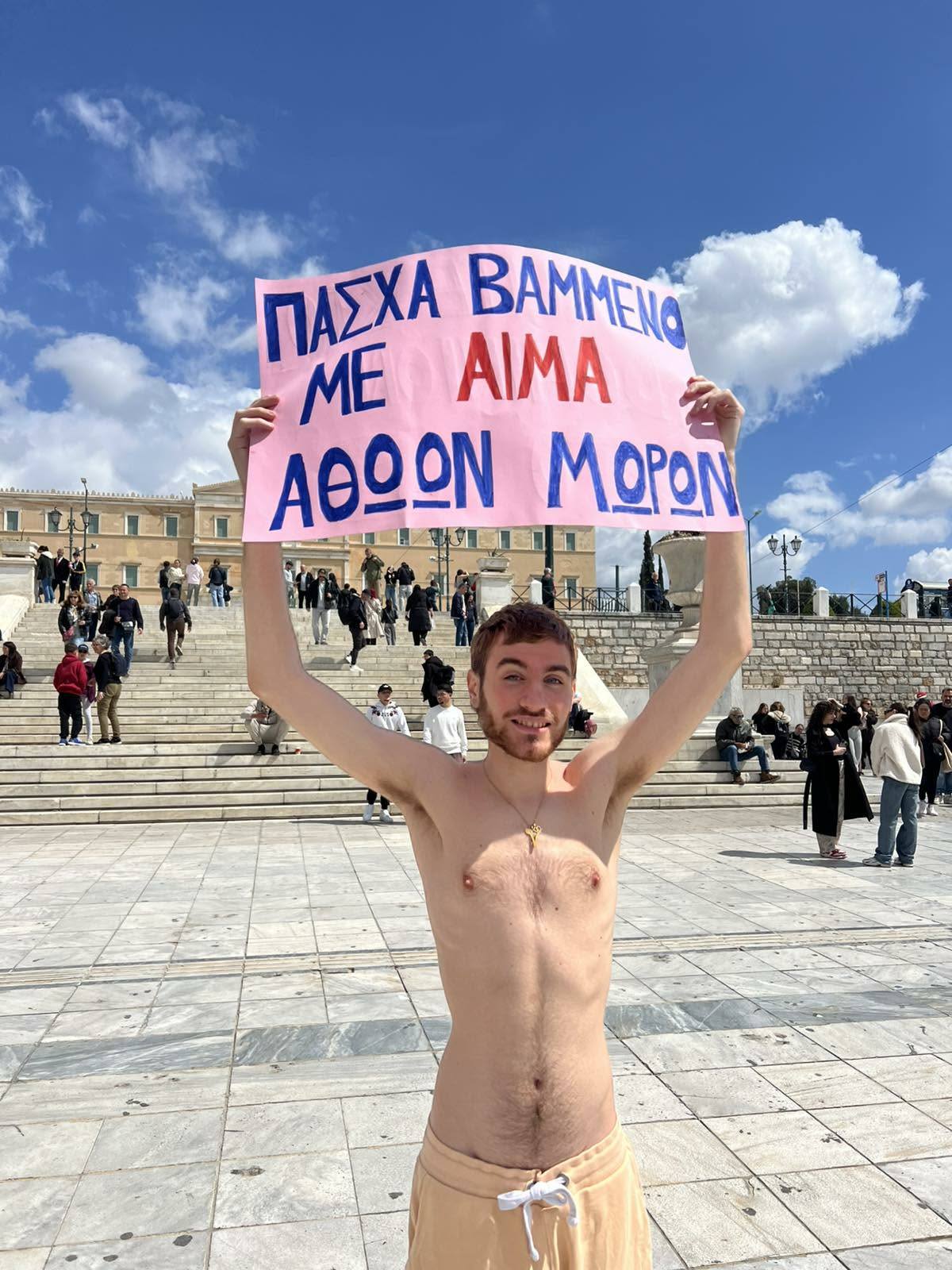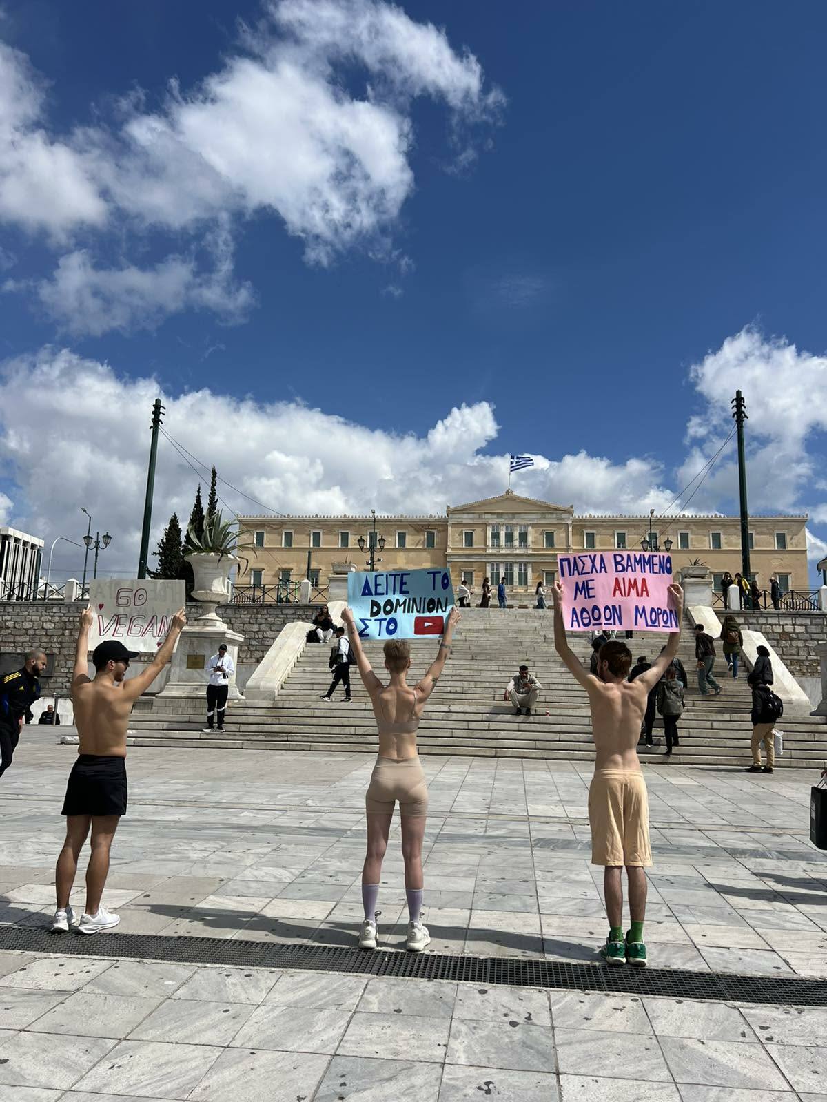 Συμβολική διαμαρτυρία πραγματοποίησαν πριν από λίγη ώρα vegan ακτιβιστές της Πανελλήνιας Ομοσπονδίας «Νέμεσις» στην Πλατεία Συντάγματος, εκφράζοντας την αντίθεσή τους στη μαζική σφαγή αμνοεριφίων ενόψει του Πάσχα.