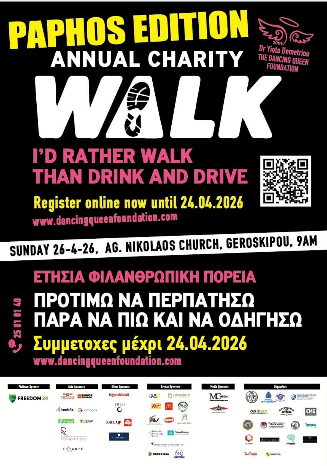 Με σύνθημα «Προτιμώ να περπατήσω, παρά να πιώ και να οδηγήσω», η φιλανθρωπική πορεία θα πραγματοποιηθεί την Κυριακή 26 Απριλίου 2026 και διοργανώνεται από το Ίδρυμα The Dancing Queen Foundation, στη μνήμη της παιδοψυχολόγου Δρ. Γιώτας Δημητρίου, η οποία έχασε τη ζωή της το 2008 σε θανατηφόρο δυστύχημα που προκλήθηκε από μεθυσμένο οδηγό.